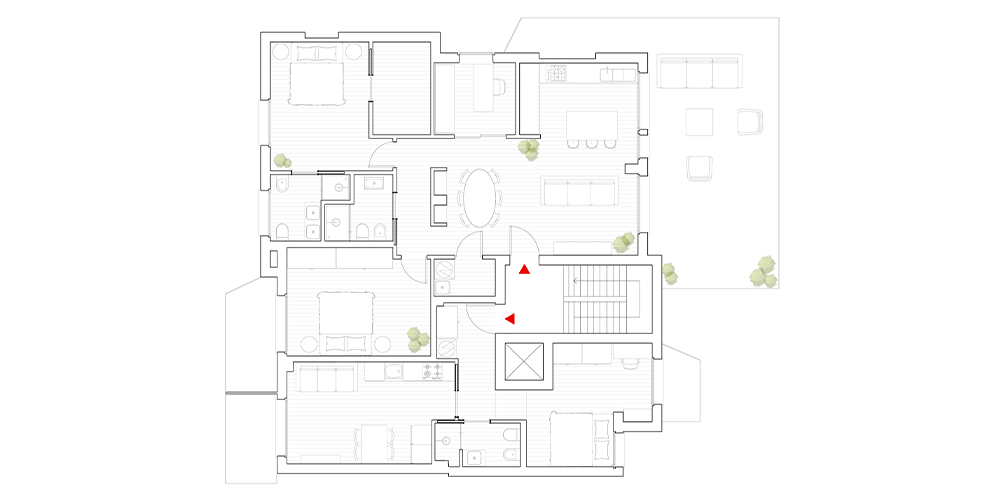 La distribuzione interna viene ripensata per creare due alloggi indipendenti, ciascuno con una propria identità e un’organizzazione chiara degli spazi: soggiorno, cucina, camere e bagni trovano un nuovo equilibrio attraverso una configurazione più fluida e razionale. Anche il terrazzo viene suddiviso, trasformandosi in due aree esterne riservate, pensate come naturale estensione degli ambienti interni.