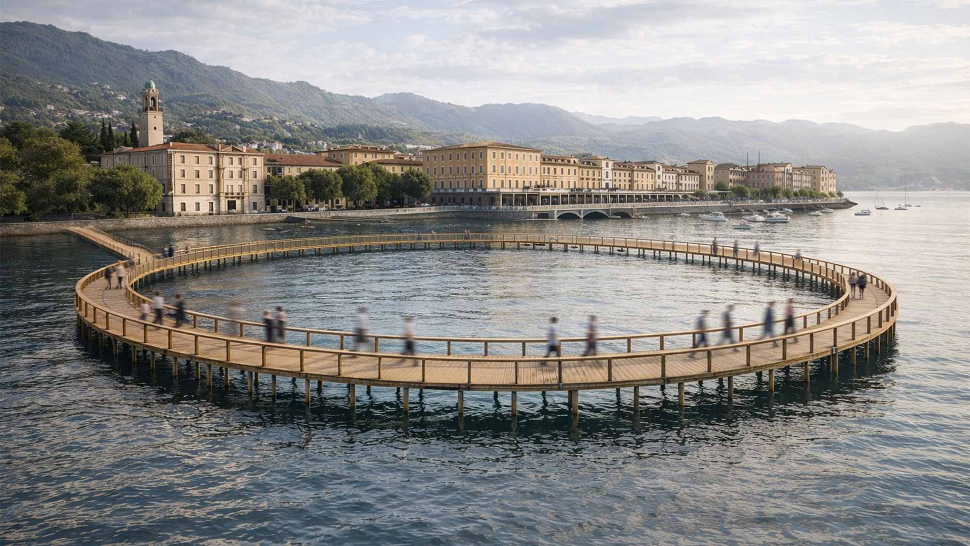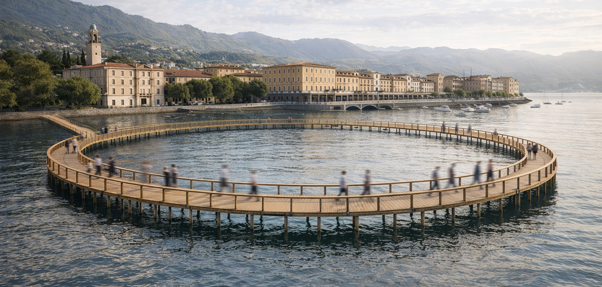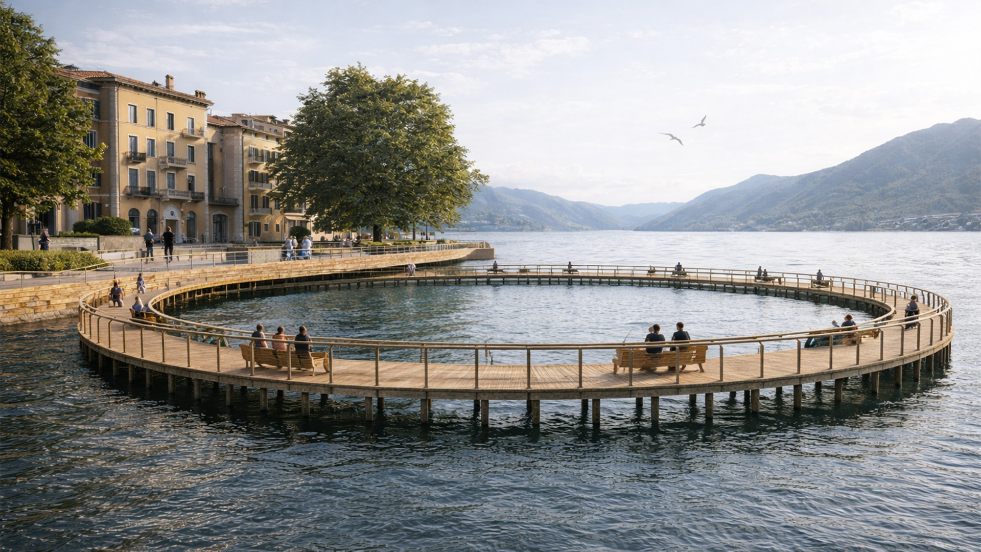 Il tema del cerchio è l’elemento centrale del progetto che eleva il panorama del lungolago a un’atmosfera intima e raccolta, attraverso un camminamento che trasforma l’ecosistema originale e la percezione di esso.