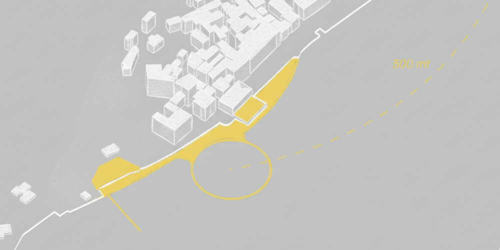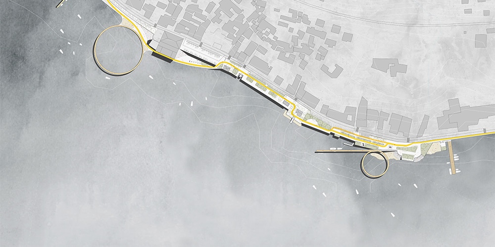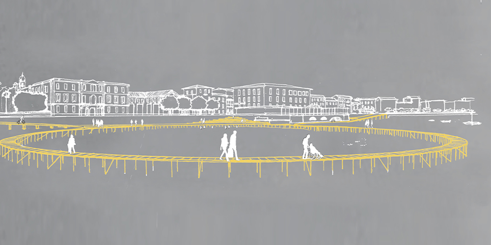L’innesto dei cerchi con la terraferma genera una serie di ambiti interstiziali che si completano con l’inserimento di spazi di sosta (aree verdi, gradonate, etc.) e piccoli chioschi di servizio in funzione delle attività diurne e serali che possono animare il lungolago.