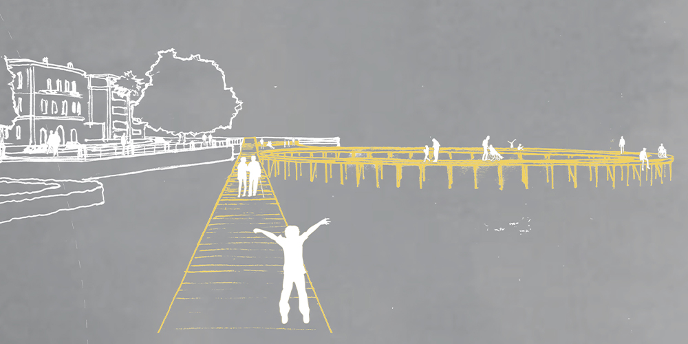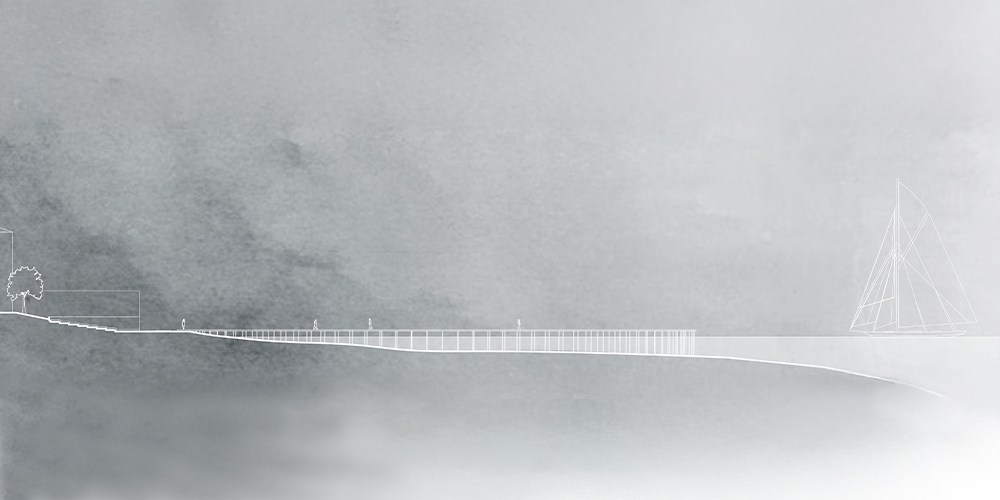 Il progetto individua una linea di demarcazione che definisce, in forma sinuosa, la posizione del limite tra spazio asciutto e spazio bagnato, tra “spazio urbano” e “spazio lacustre”, e la rende evidente con due manufatti in legno.