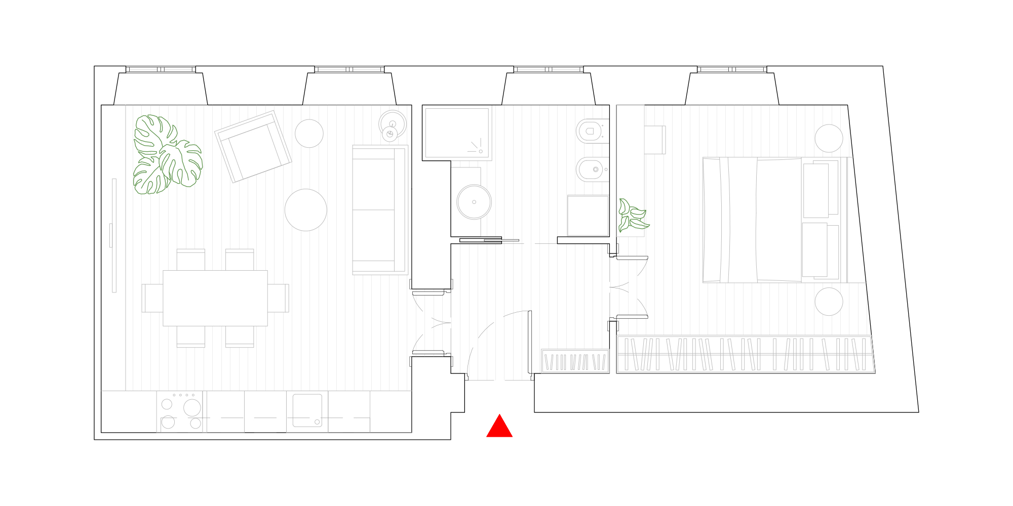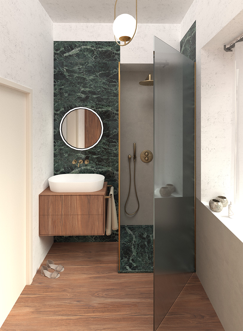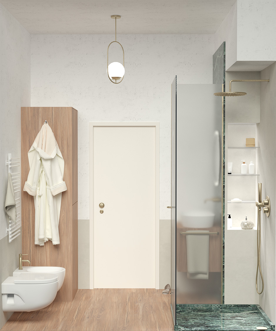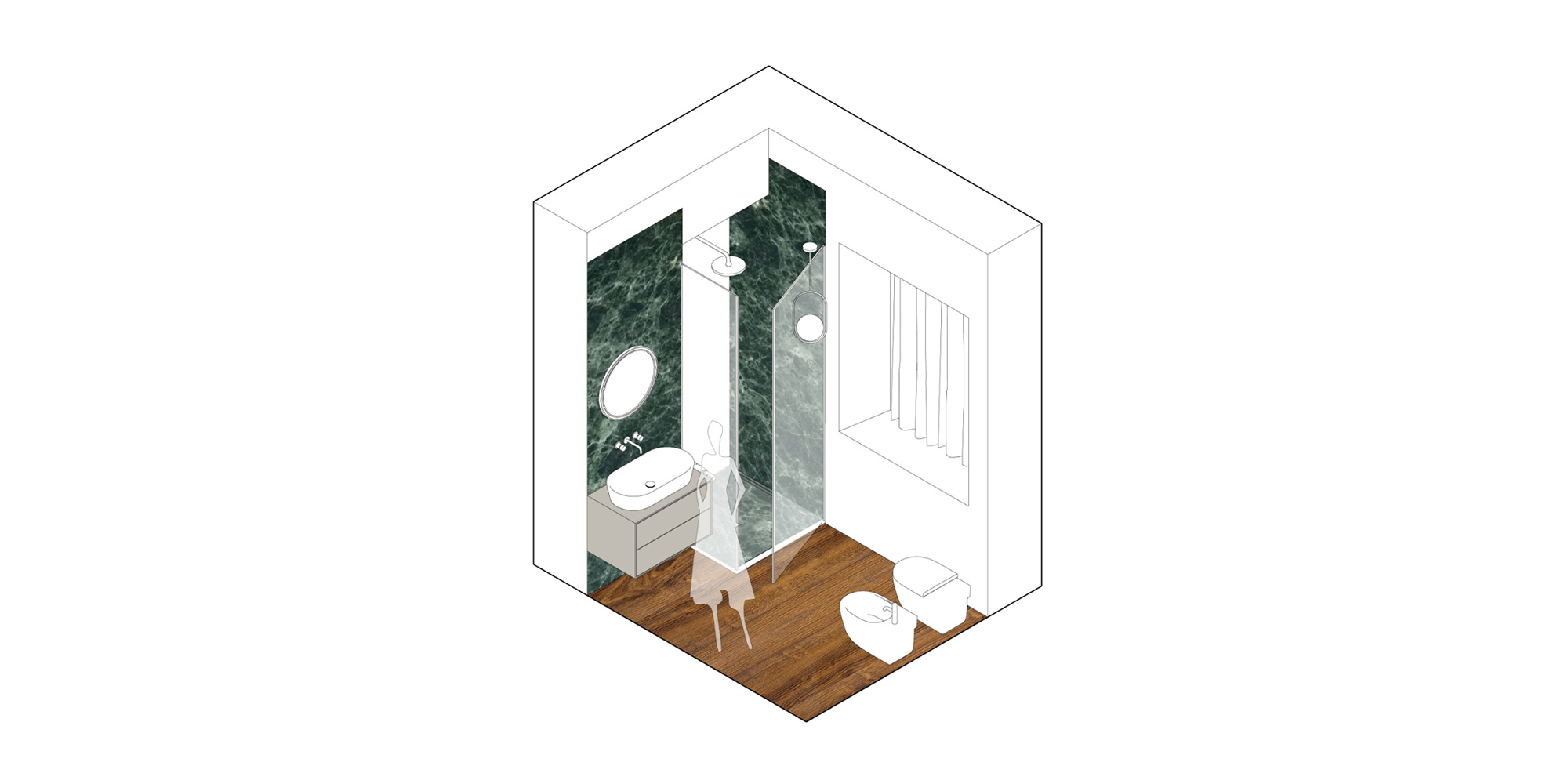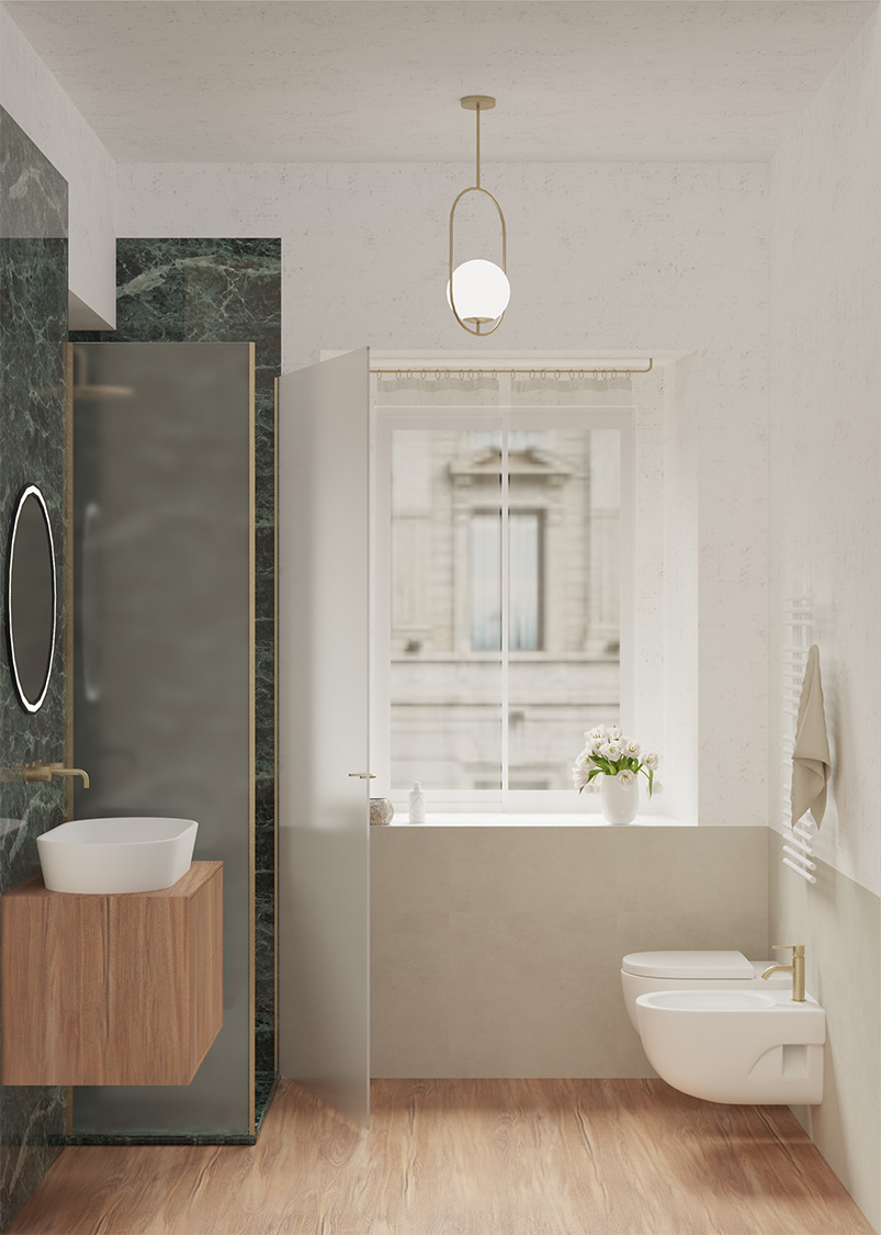 La palette di colori, che variano tra i verdi e i grigi caldi, si mescola e si ripropone anche nello spazio giorno: un’ampia sala che accoglie la cucina in linea e il salotto con zona pranzo. La progettazione a tutto tondo, dal design d’interni al posizionamento degli impianti dell’appartamento, consente di non avere nulla a vista e di sfruttare ogni angolo a disposizione, come si può intuire dal controsoffitto ribassato in corridoio che consente di posizionare lo scaldabagno, oltre che l’illuminazione incassata e la macchina interna per l’impianto di condizionamento canalizzato.
