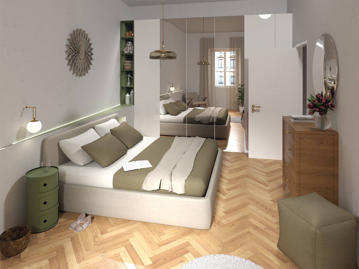 Le finiture sono il vero punto di forza: gli arredi su misura sono studiati valorizzando le particolarità del luogo e i colori aiutano l’esaltazione delle singolarità. Nella camera da letto la parete di fondo fuori angolo viene compensata dalla struttura del mobilio su misura, che trasforma questa irregolarità un’occasione per la creazione di una mensola con illuminazione incassata.