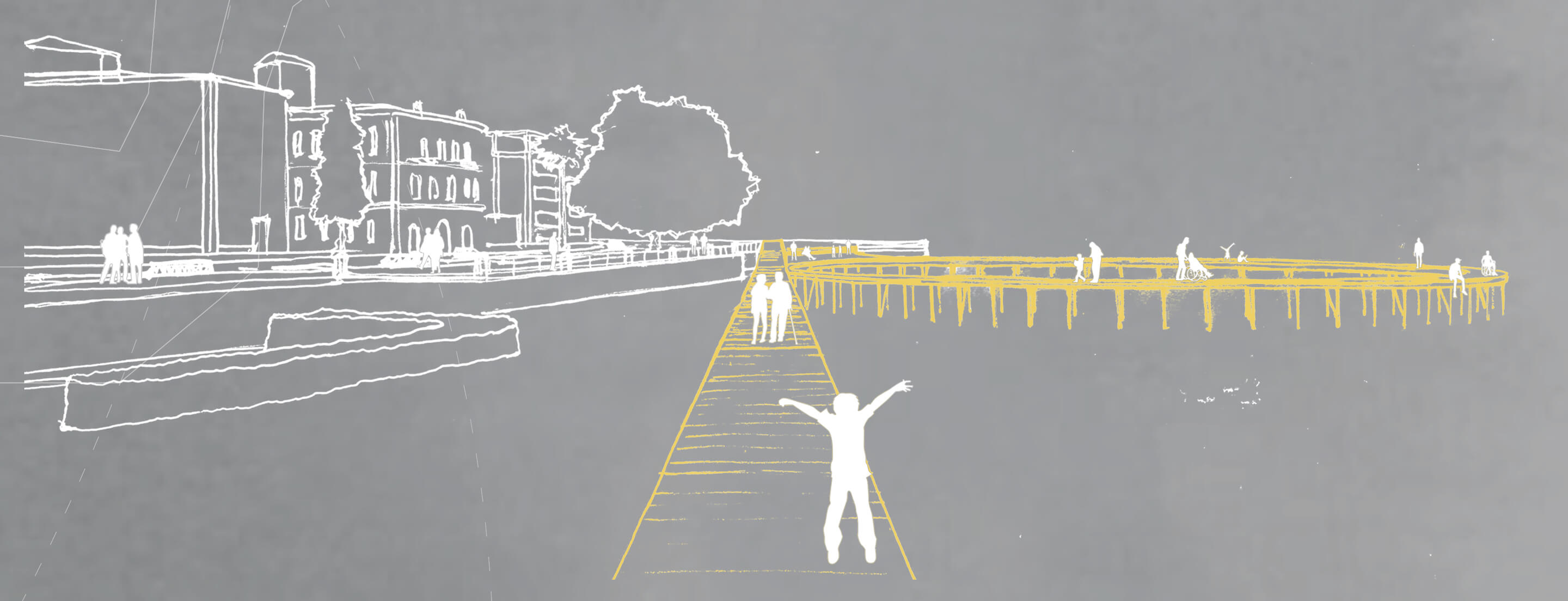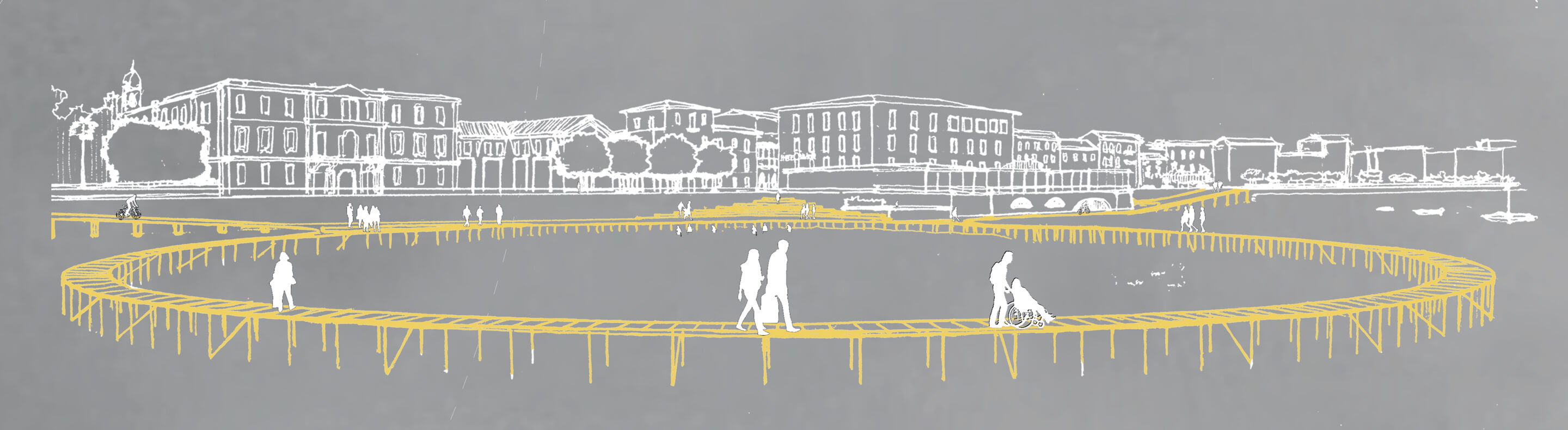 L’innesto dei cerchi con la terraferma si completa con l’inserimento di spazi di sosta quali aree verdi, gradonate e piccoli chioschi di servizio in funzione delle attività diurne e serali che animano il luogo. Inoltre, le gradonate costituiscono punti da cui è possibile ammirare il molo circolare e il lago sullo sfondo, uno spettacolo emozionante con protagonista il lago e la passeggiata sospesa tra il cielo e l’acqua.