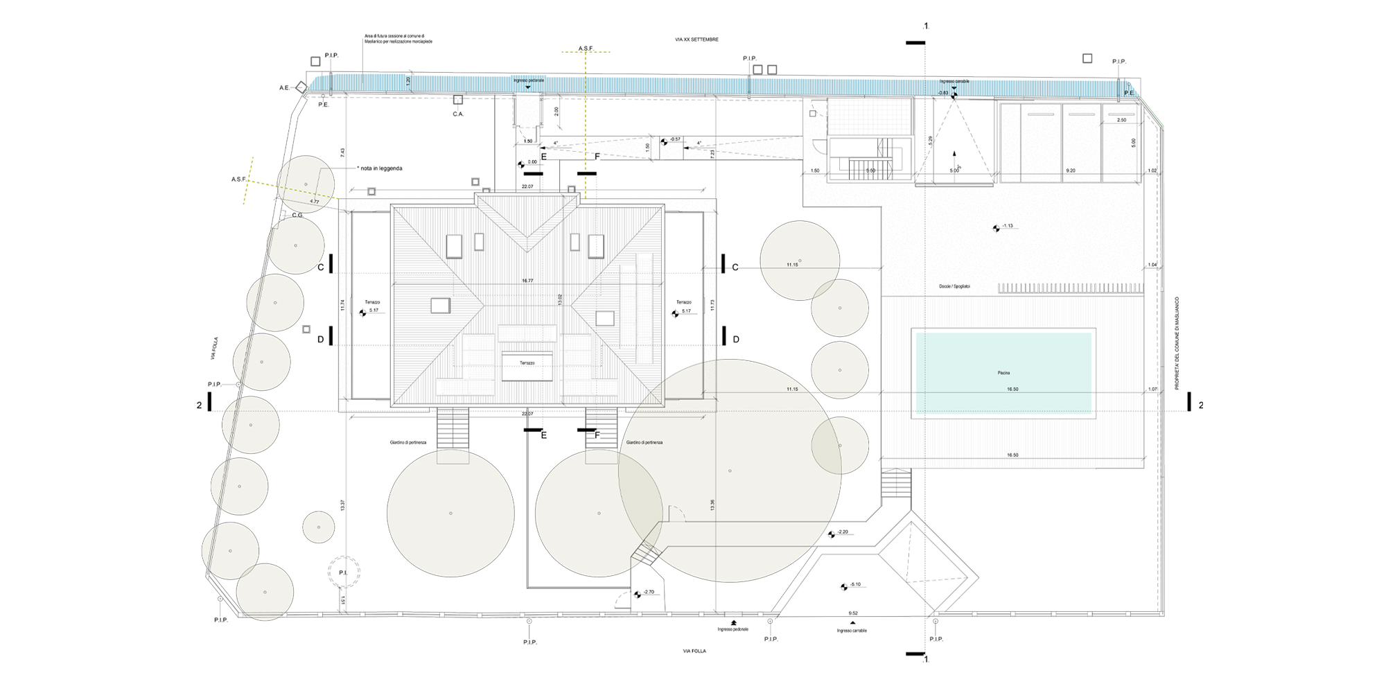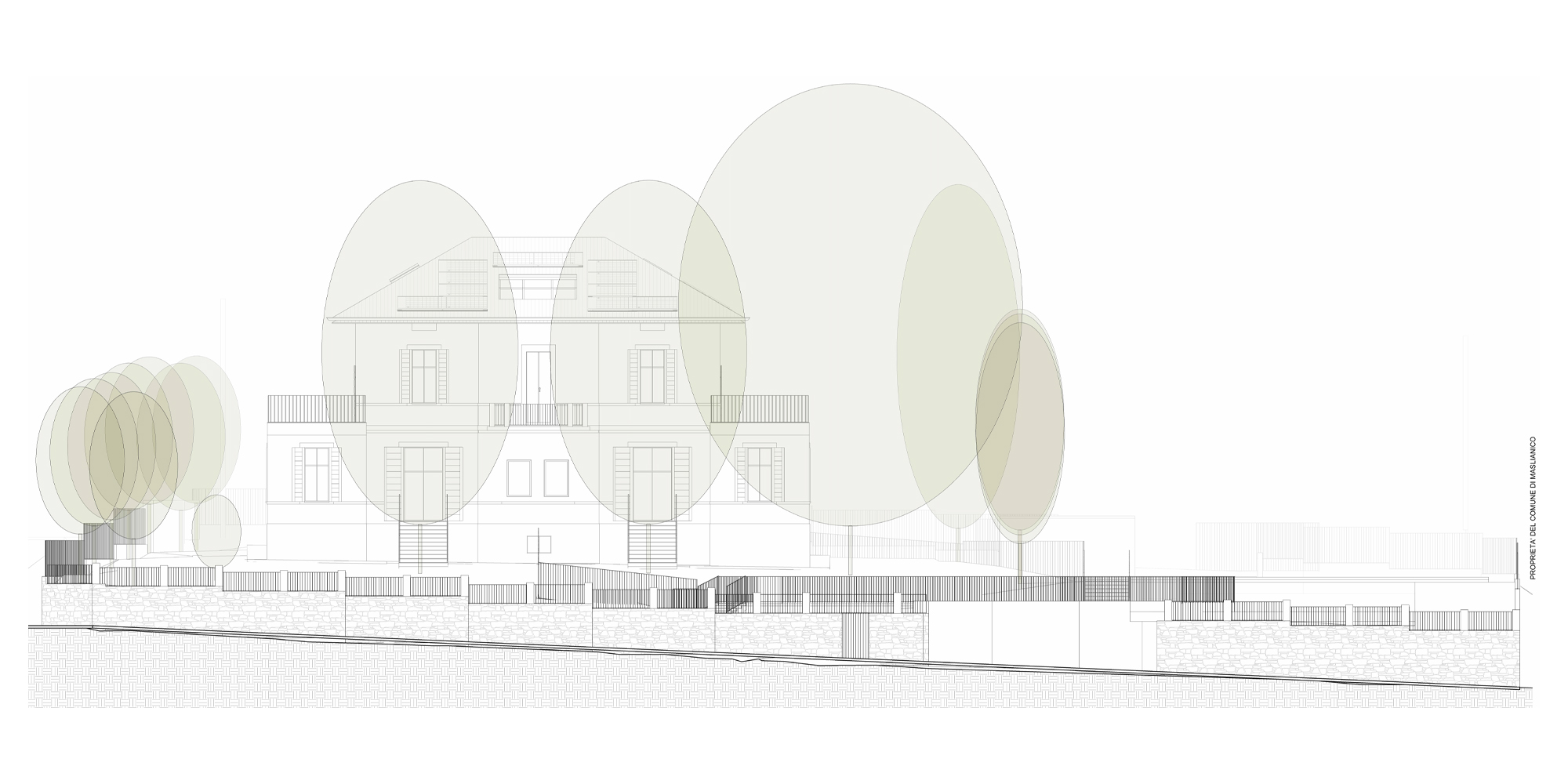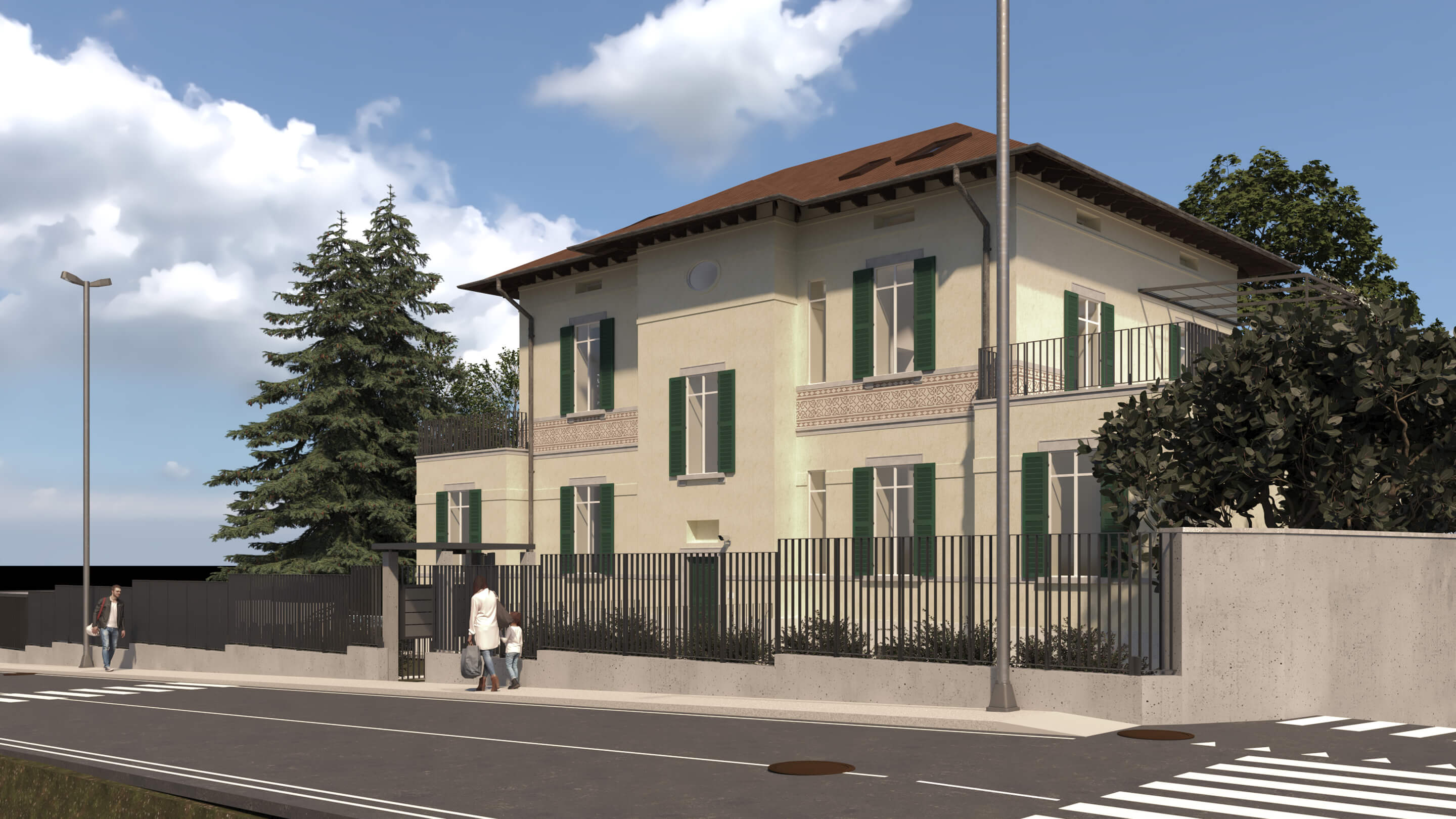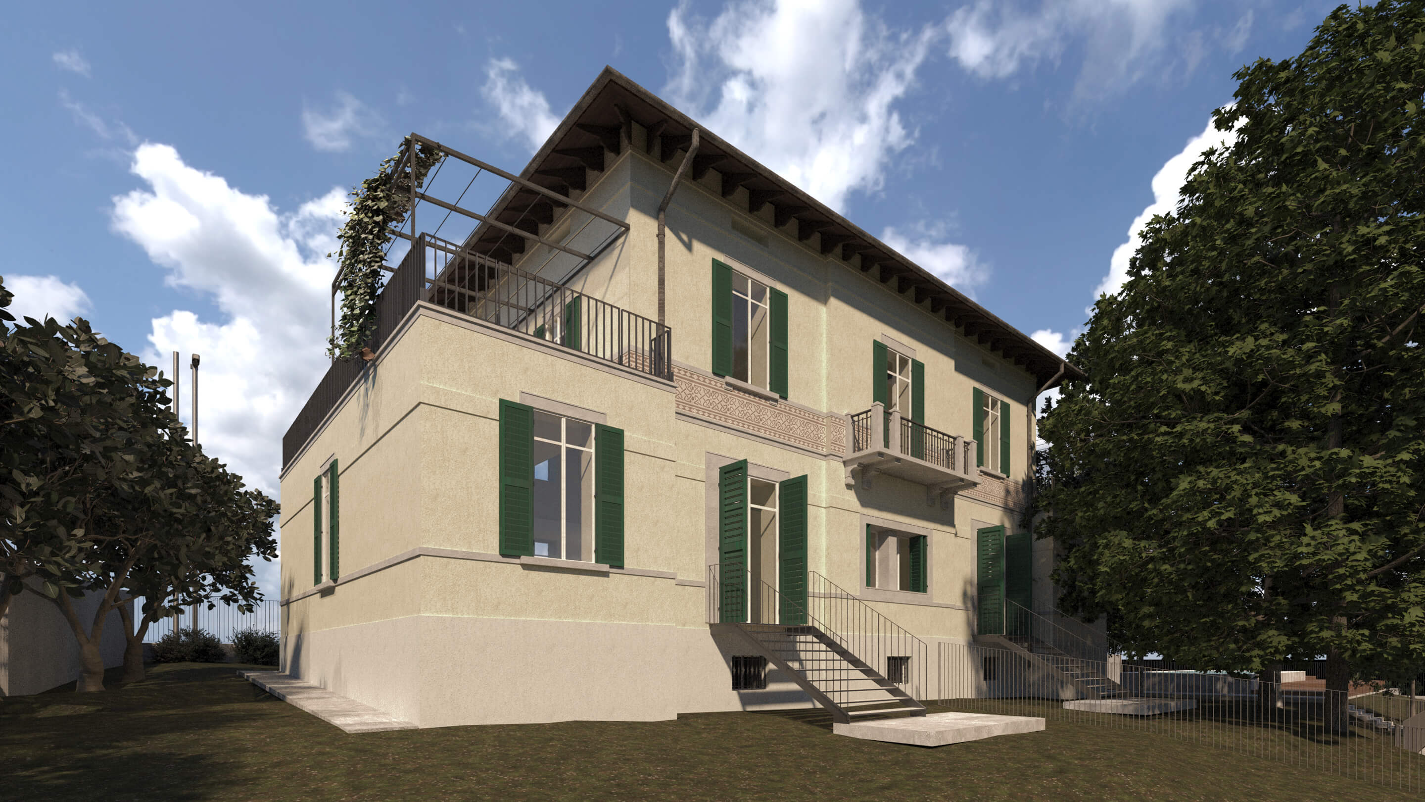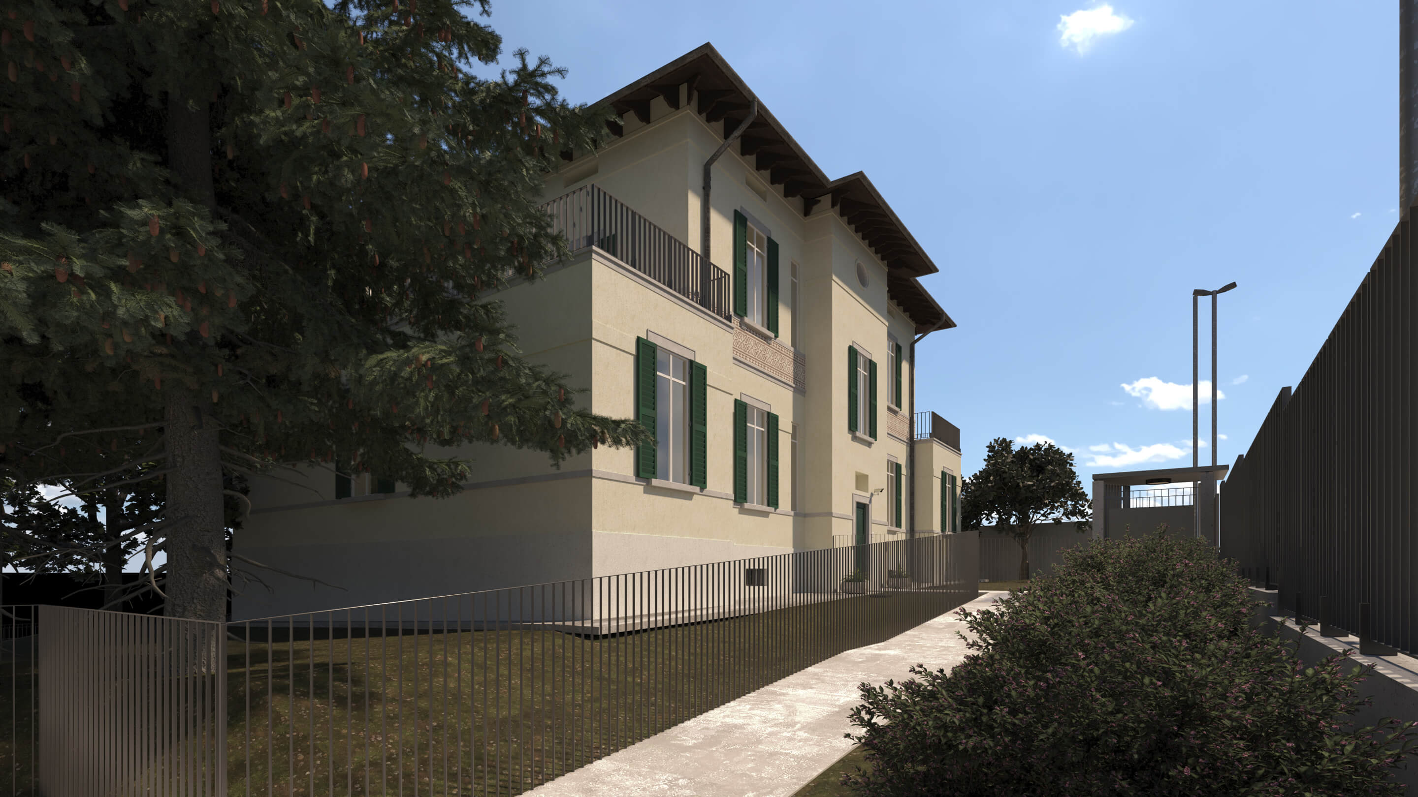 Gli spazi ai lati dell’edificio sono stati ampliati per dare maggiore importanza alla villa, non alterandone i caratteri. Questa attività ha consentito di allargare lo spazio della zona notte degli appartamenti situati al piano terra e i terrazzi del primo piano, che affacciano sul giardino che circonda la struttura.