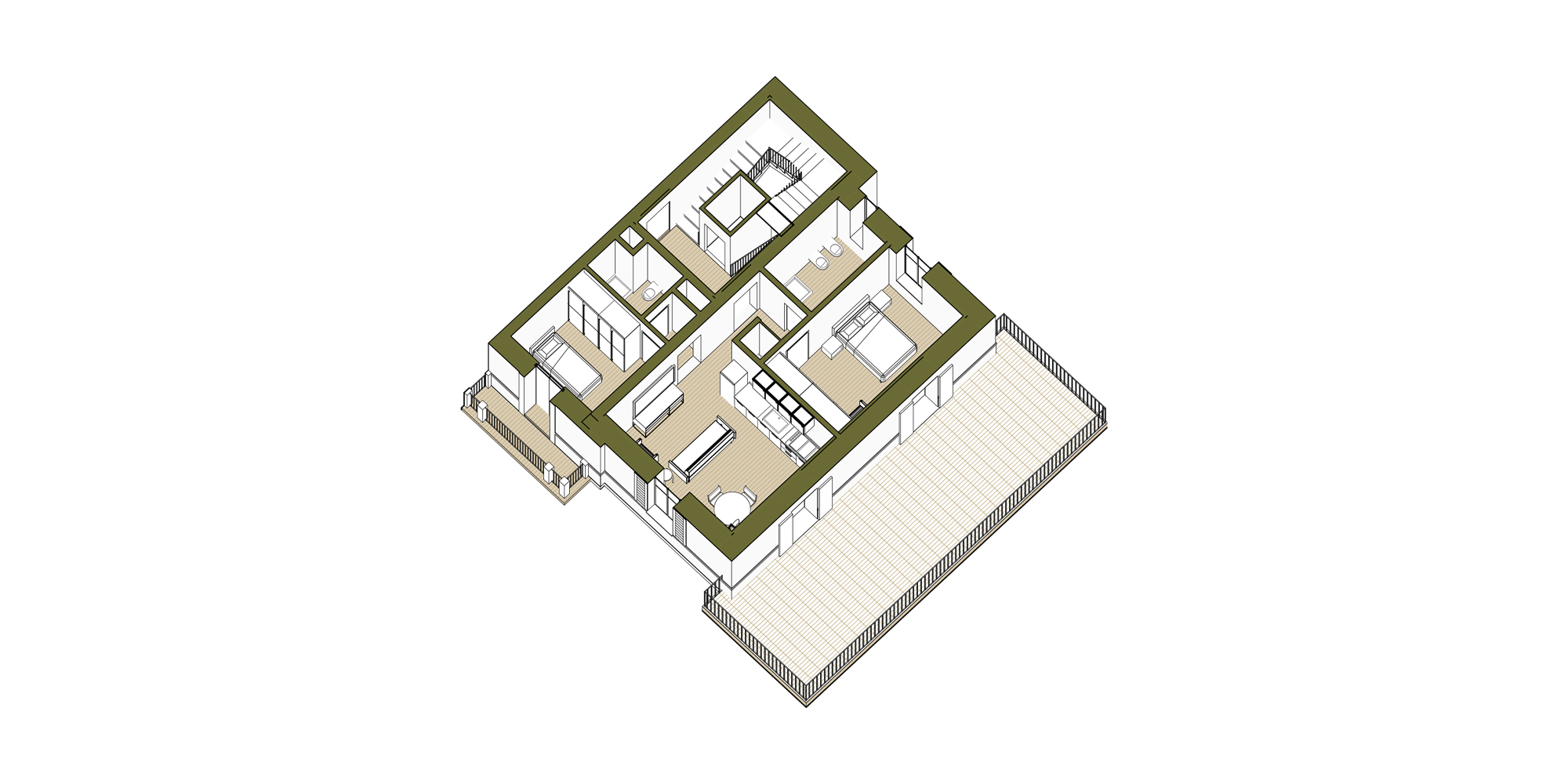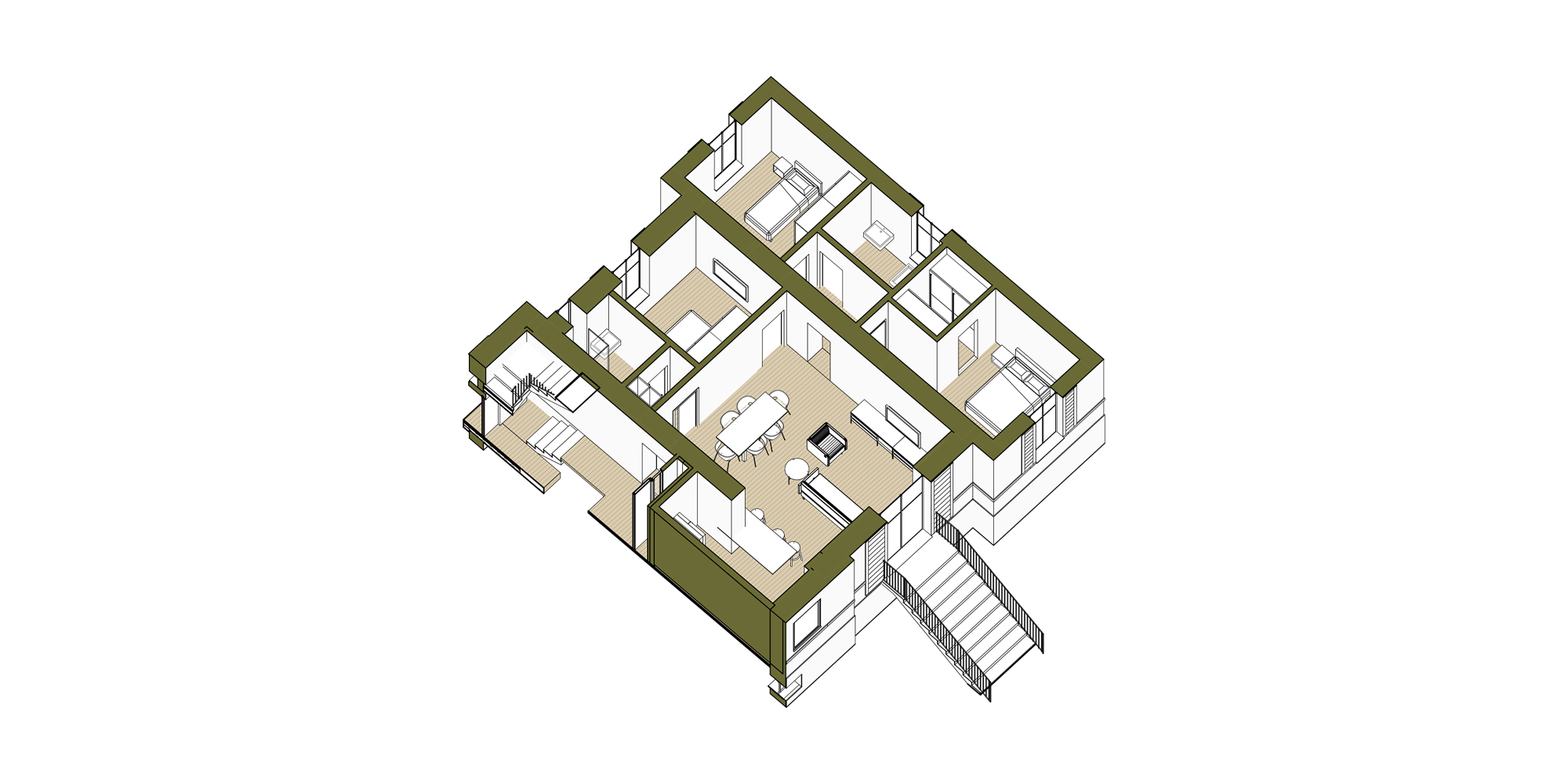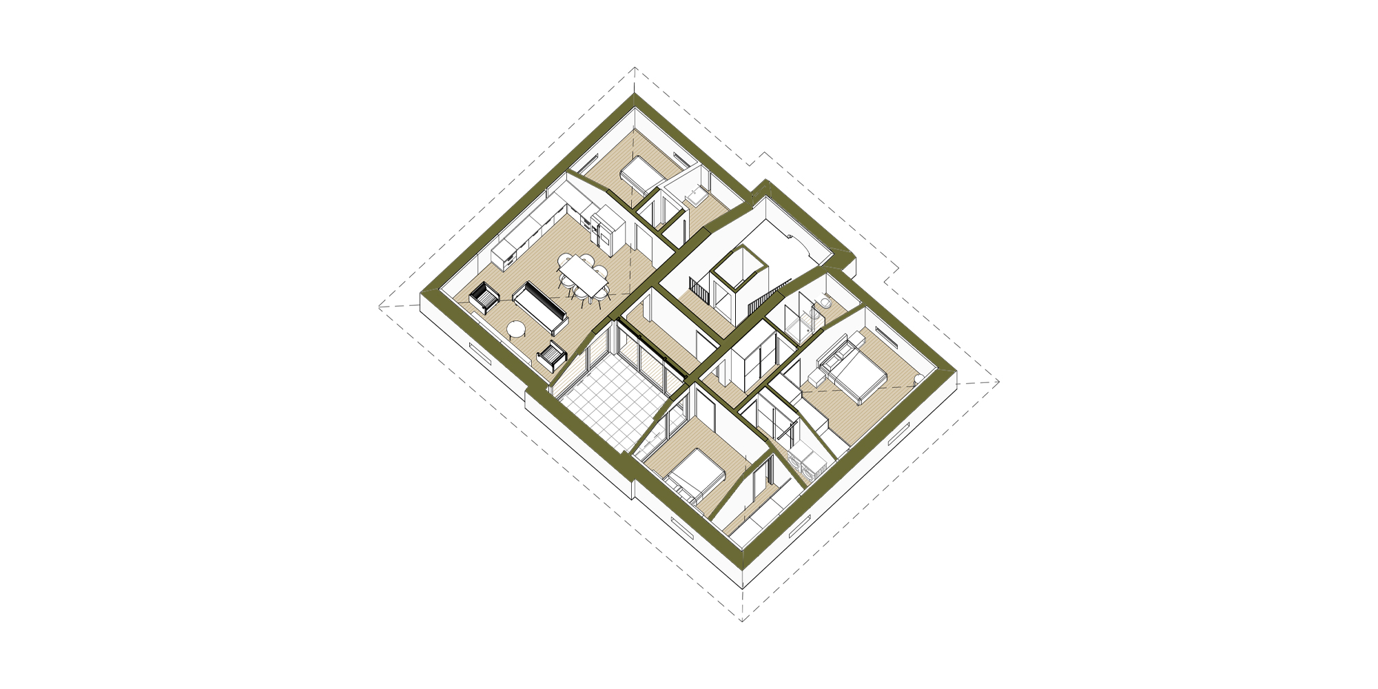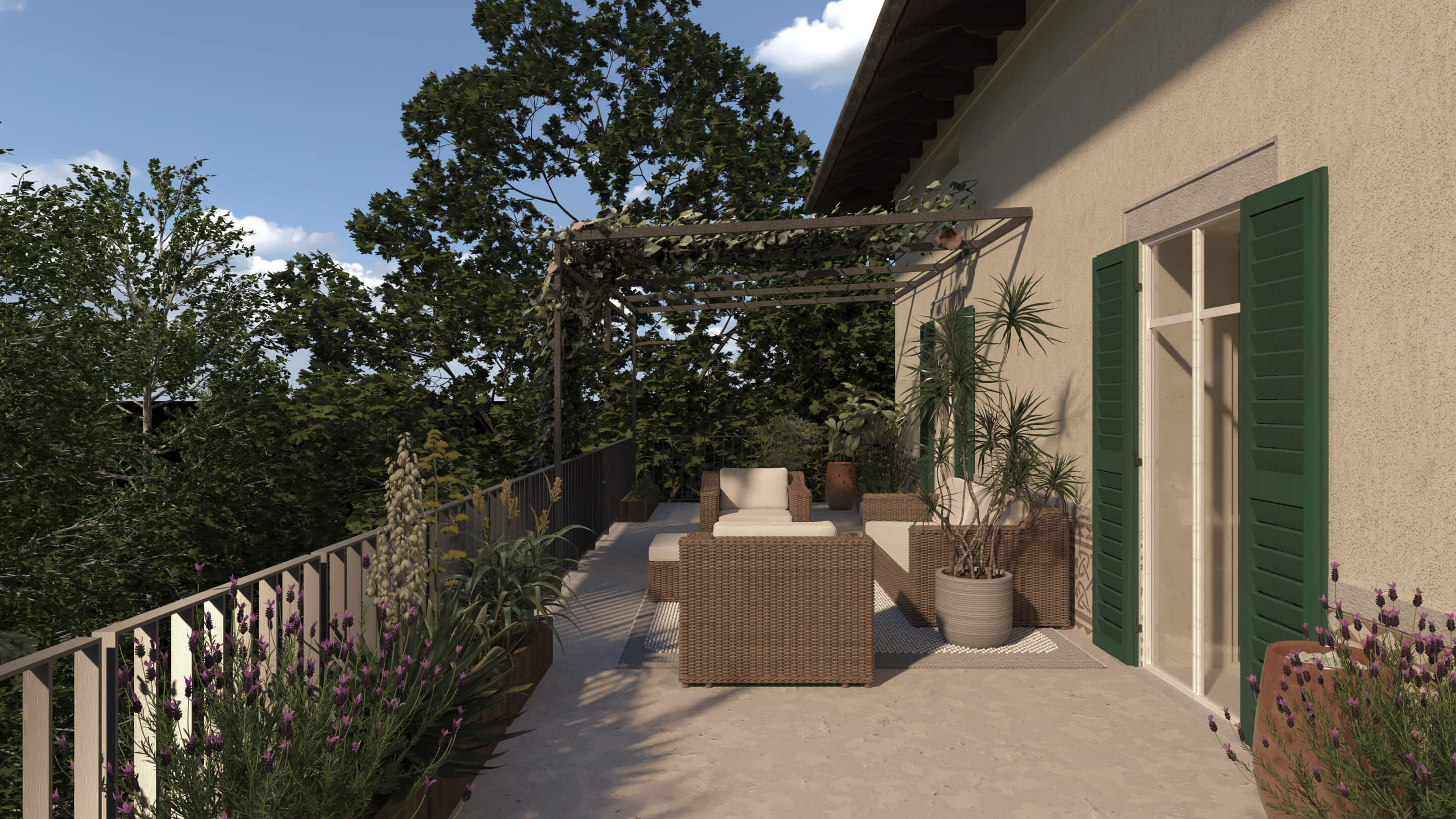 Gli spazi ai lati dell’edificio sono stati ampliati per dare maggiore importanza alla villa, non alterandone i caratteri. Questa attività ha consentito di allargare lo spazio della zona notte degli appartamenti situati al piano terra e i terrazzi del primo piano, che affacciano sul giardino che circonda la struttura.