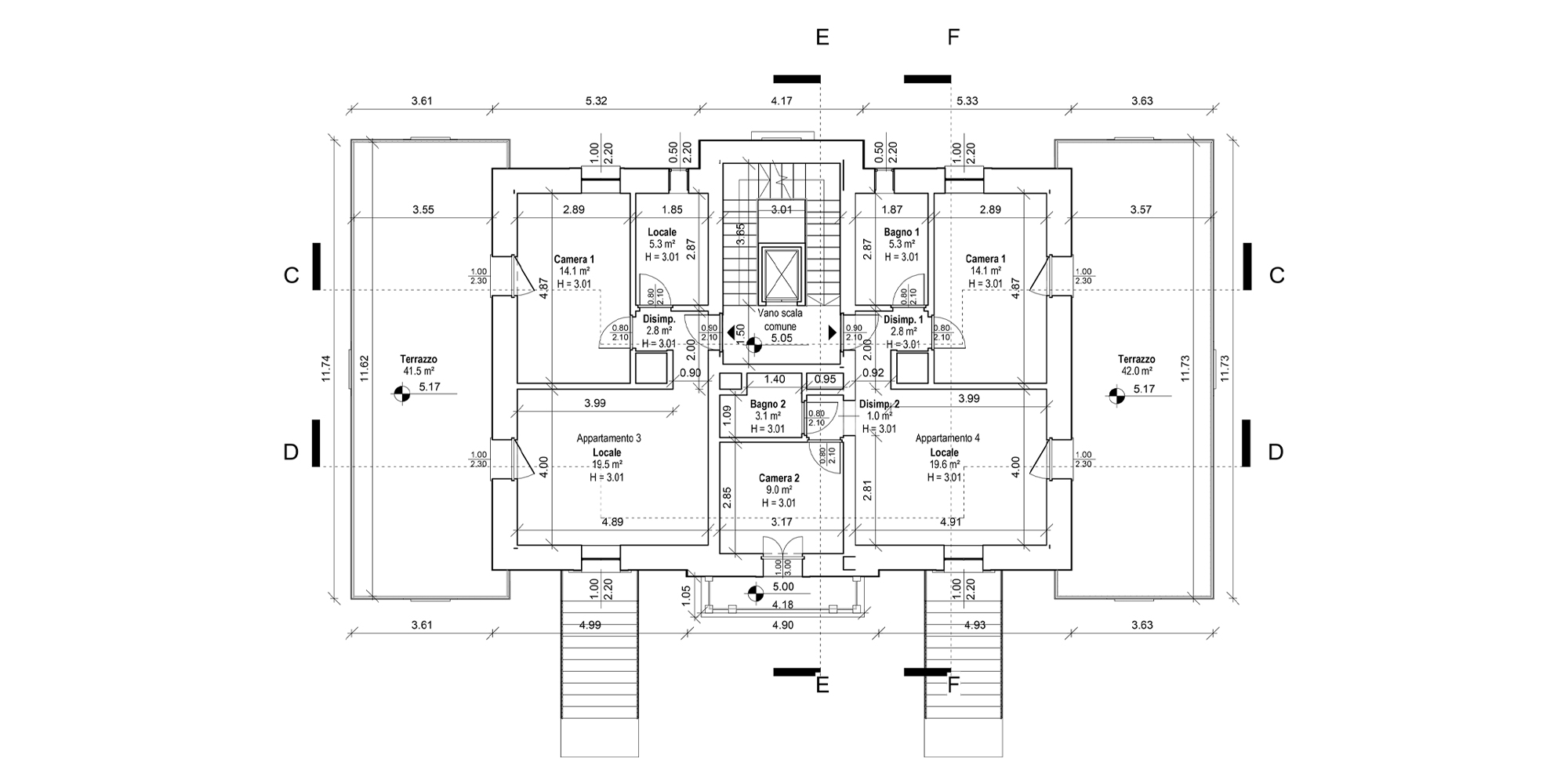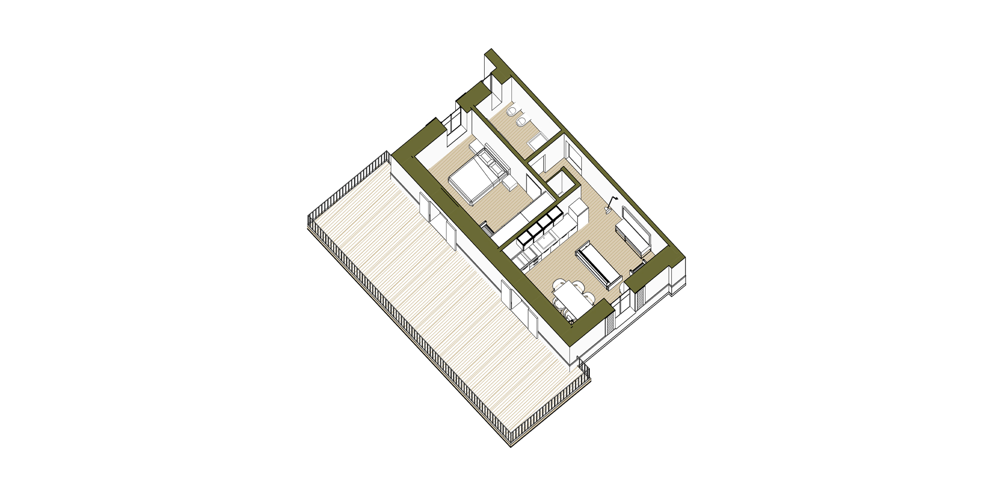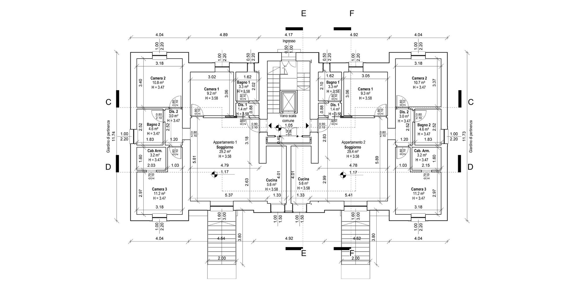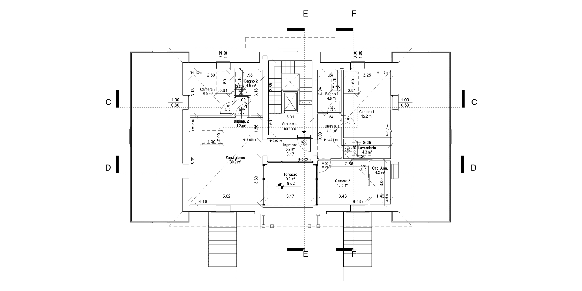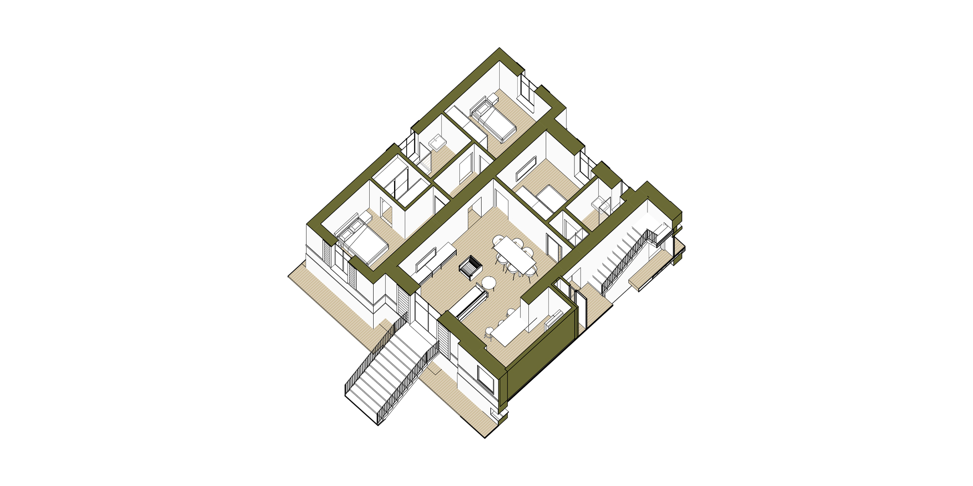 Gli spazi ai lati dell’edificio sono stati ampliati per dare maggiore importanza alla villa, non alterandone i caratteri. Questa attività ha consentito di allargare lo spazio della zona notte degli appartamenti situati al piano terra e i terrazzi del primo piano, che affacciano sul giardino che circonda la struttura.