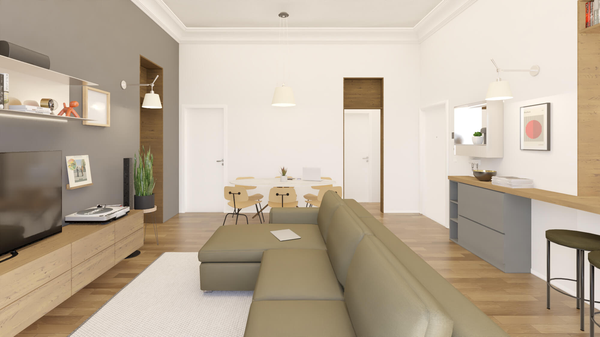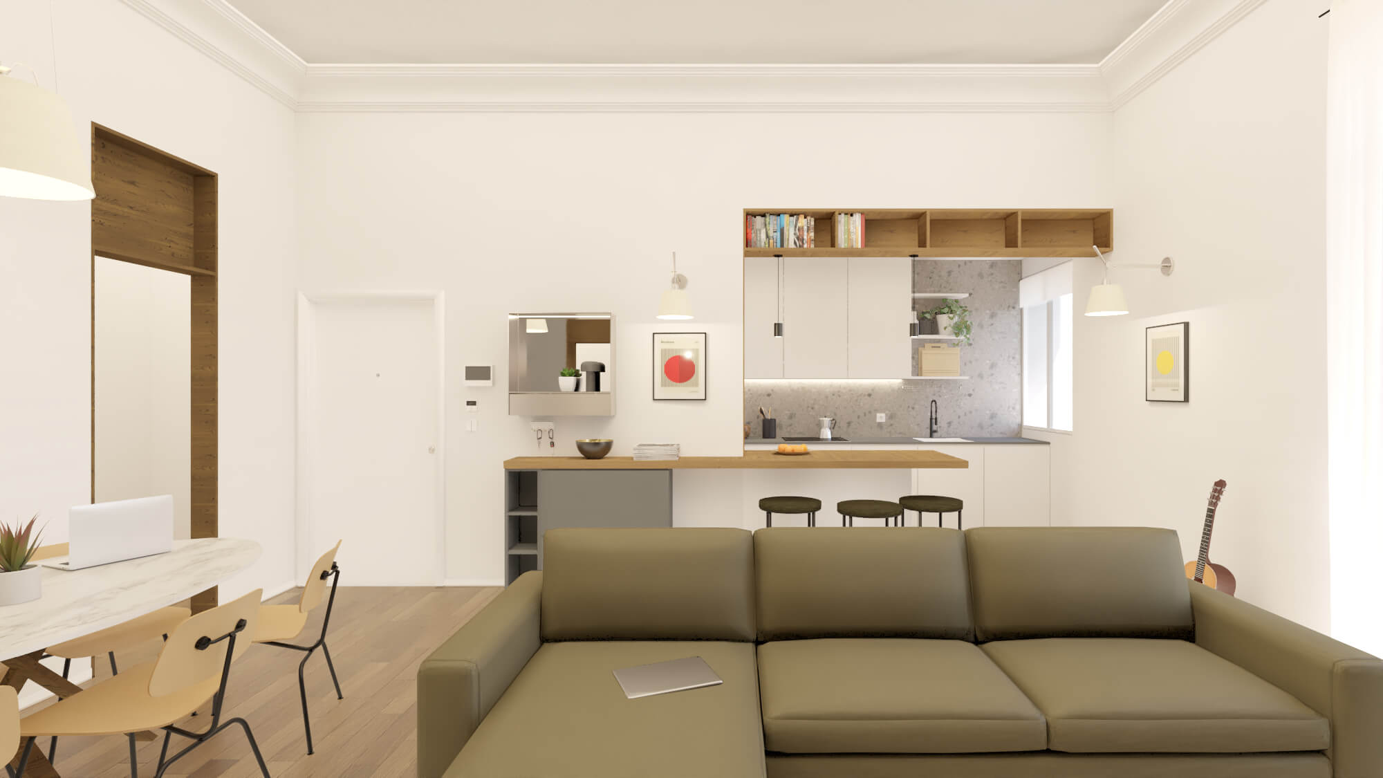 Al suo interno, la villa è suddivisa in cinque appartamenti che si sviluppano su tre piani. I due appartamenti al piano terra godono di un accesso sul prospetto posteriore al giardino privato, mentre i due appartamenti bilocali al primo piano sfruttano la grande terrazza. Infine, il secondo piano è dedicato a un unico ampio appartamento.