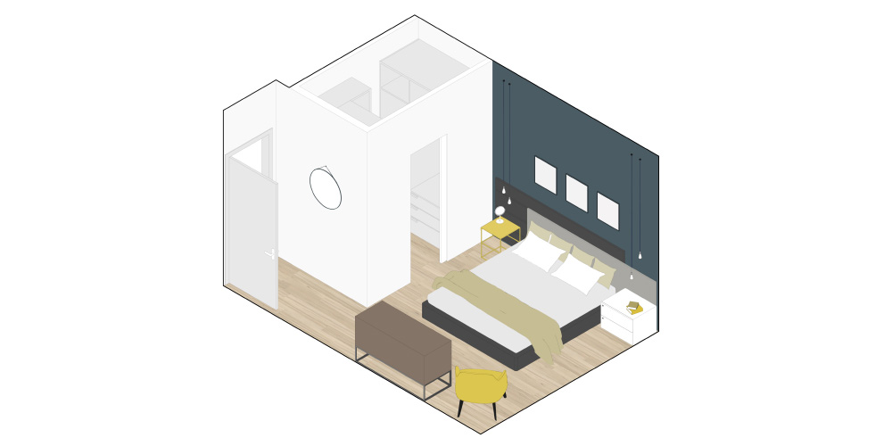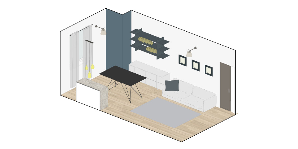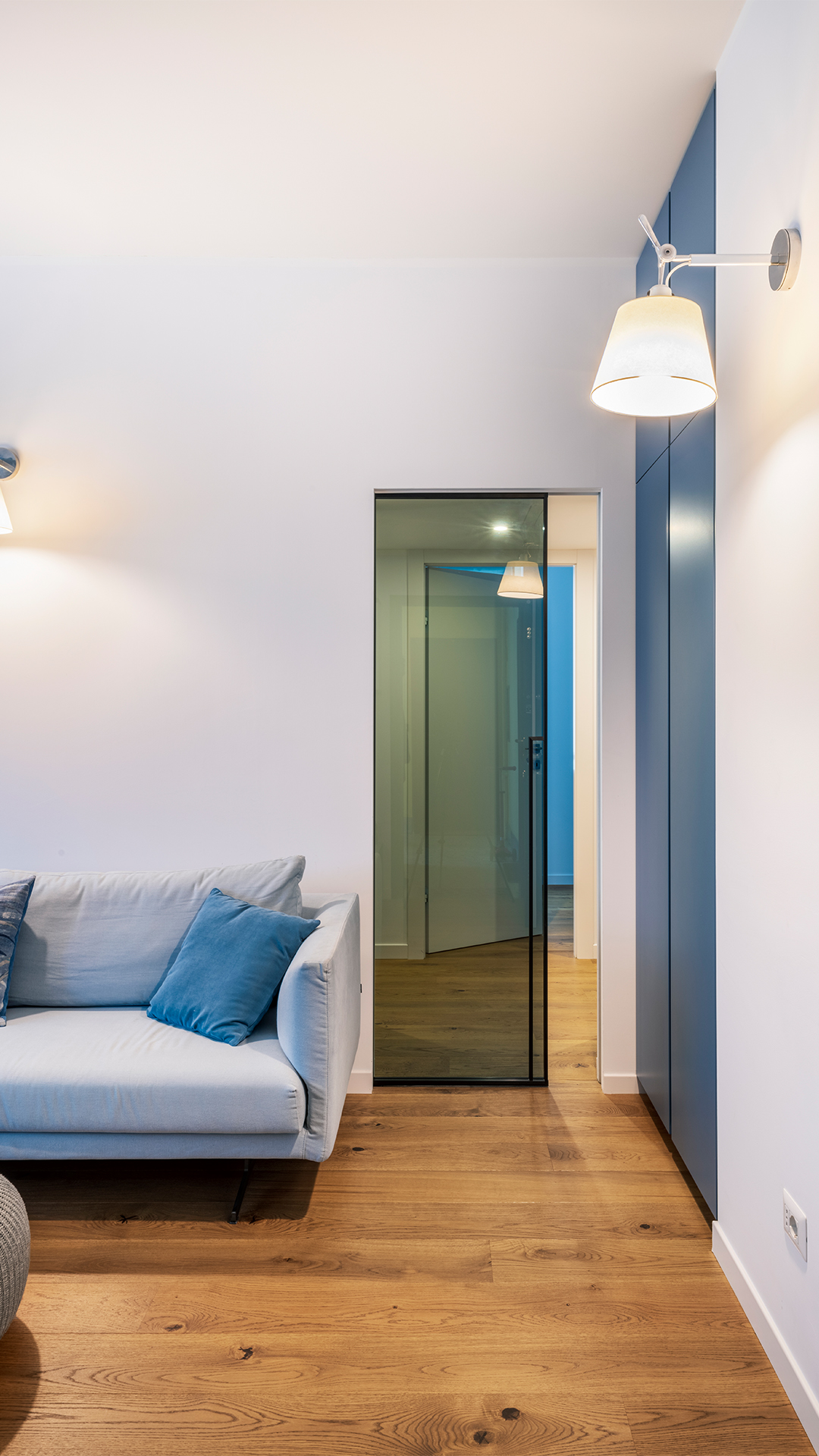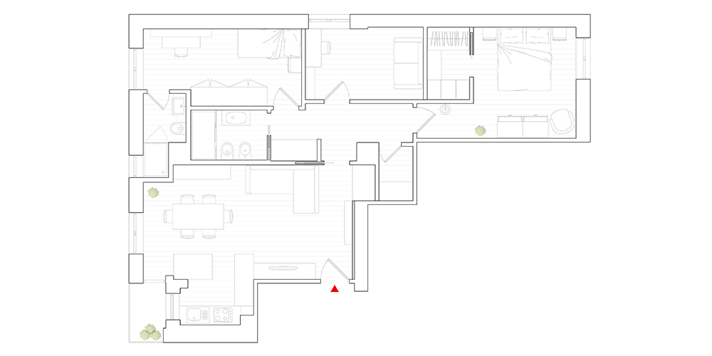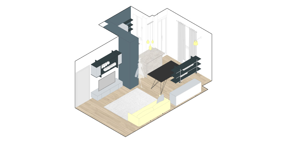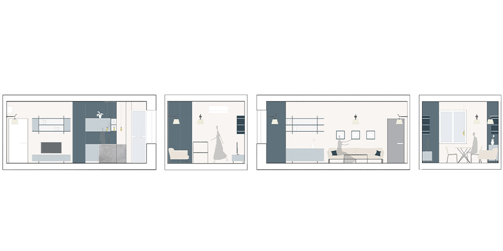 Il punto di partenza era un appartamento frazionato in piccole stanze, distribuite da un lungo corridoio cieco. Il progetto nasce invece dalle esigenze di una giovane coppia, alla ricerca di un luogo accogliente e pronto a ospitare una famiglia. Gli spazi di vita diventano generosi creando un’ampia sala con angolo cottura, destinata a ospitare serate relax e grandi pranzi all’occorrenza. Il corridoio, ridotto al minimo, separa la zona notte donandole privacy e consente la distribuzione di tre camere e due bagni. La camera-studio è separata dalla camera matrimoniale da una cabina armadio, che potrà essere ampliata o ridotta a seconda delle future esigenze della famiglia.