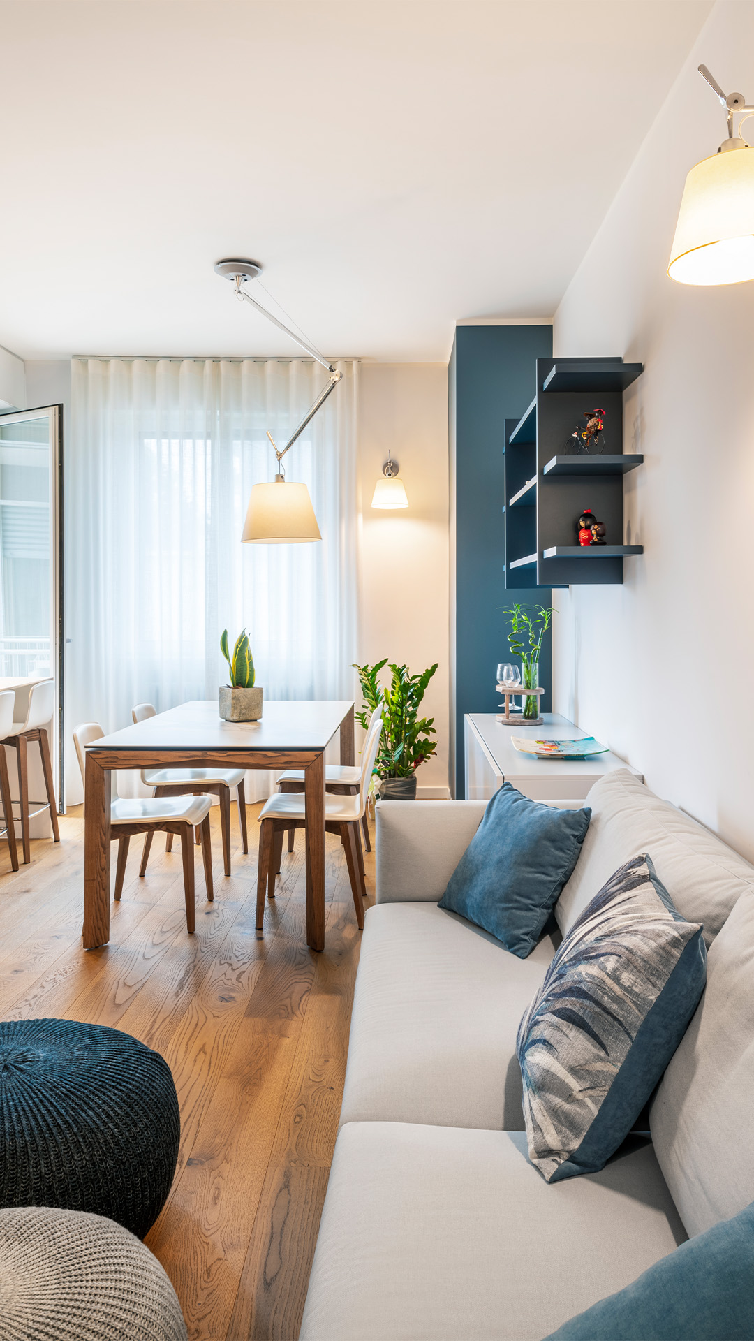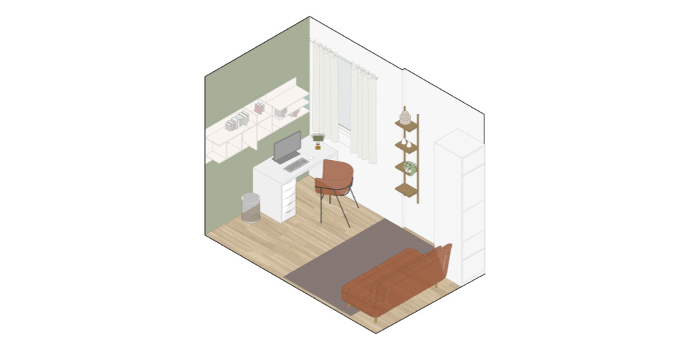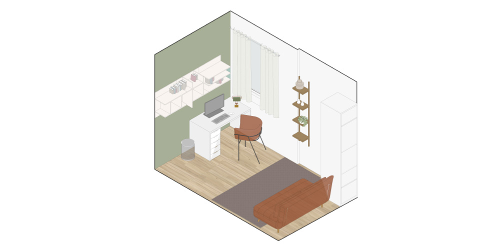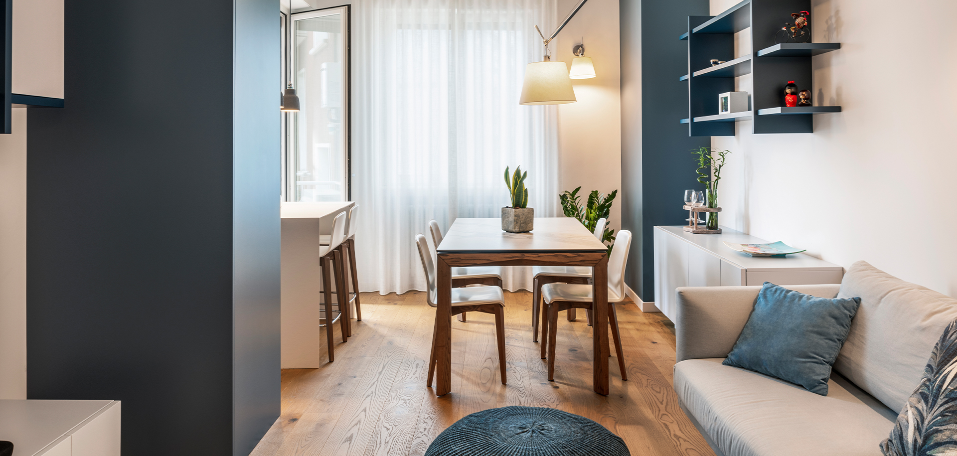 Il punto di partenza era un appartamento frazionato in piccole stanze, distribuite da un lungo corridoio cieco. Il progetto nasce invece dalle esigenze di una giovane coppia, alla ricerca di un luogo accogliente e pronto a ospitare una famiglia. Gli spazi di vita diventano generosi creando un’ampia sala con angolo cottura, destinata a ospitare serate relax e grandi pranzi all’occorrenza. Il corridoio, ridotto al minimo, separa la zona notte donandole privacy e consente la distribuzione di tre camere e due bagni. La camera-studio è separata dalla camera matrimoniale da una cabina armadio, che potrà essere ampliata o ridotta a seconda delle future esigenze della famiglia.