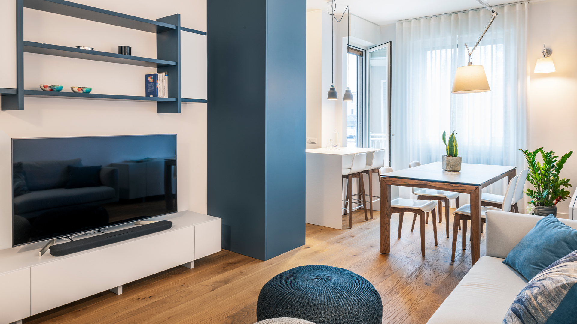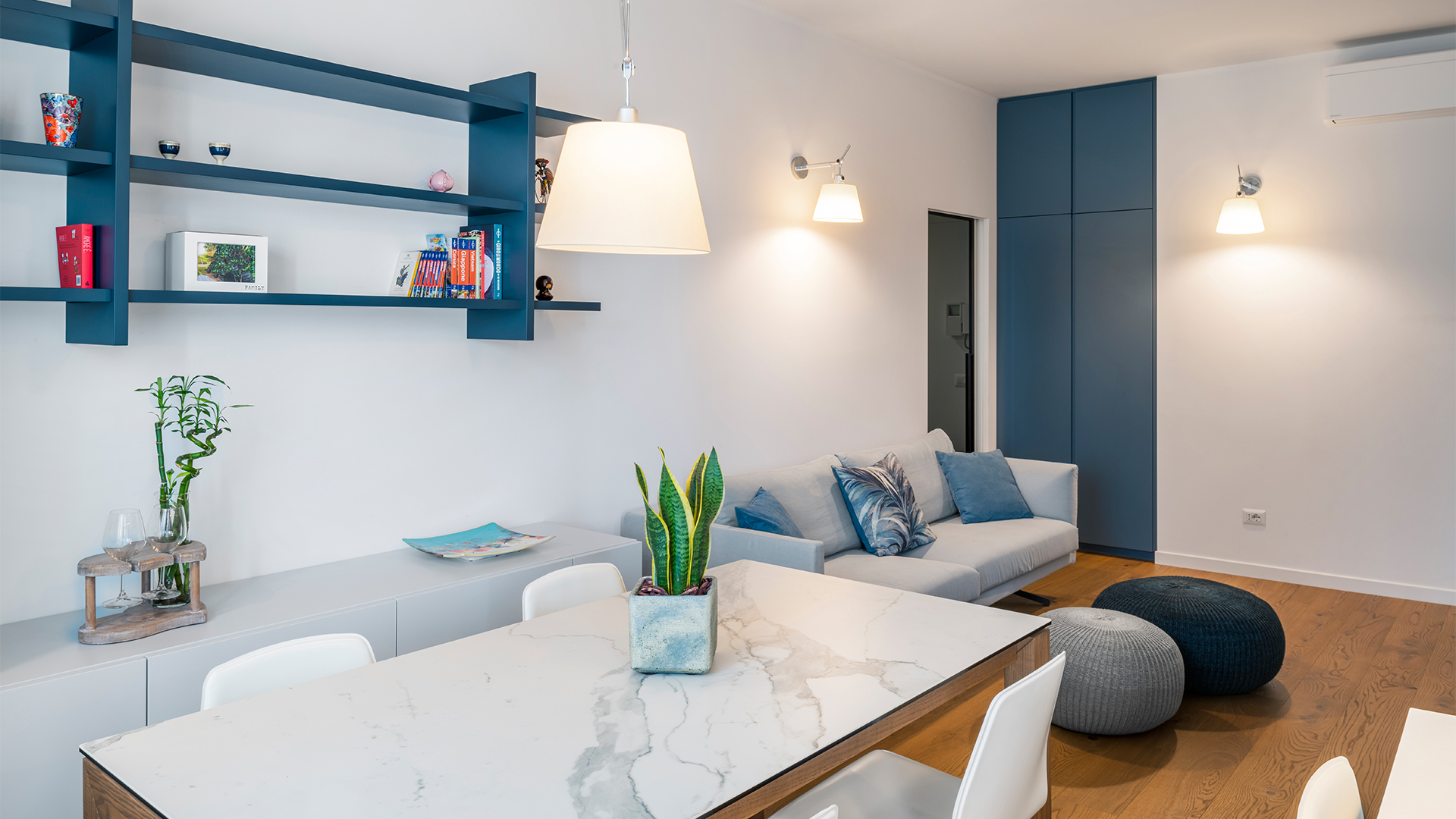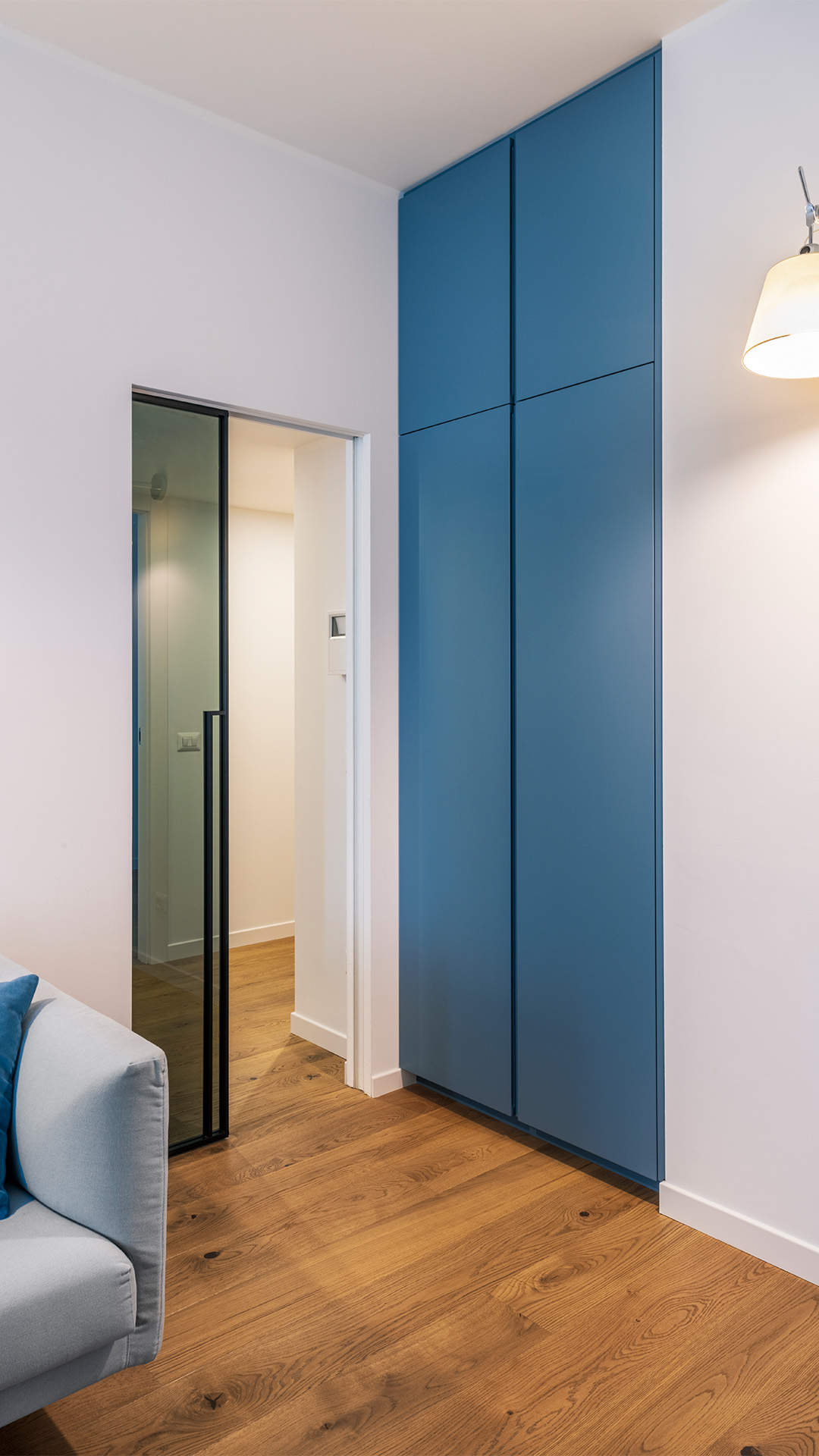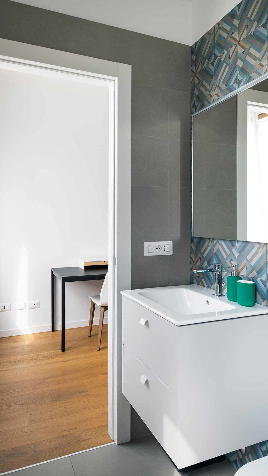 La palette materica studiata prevede materiali caldi e accoglienti come il legno color miele dei pavimenti e gli azzurri per le pareti, fino a un blu oltremare per gli arredi fissi. Piastrelle con fantasie geometriche arricchiscono i bagni.