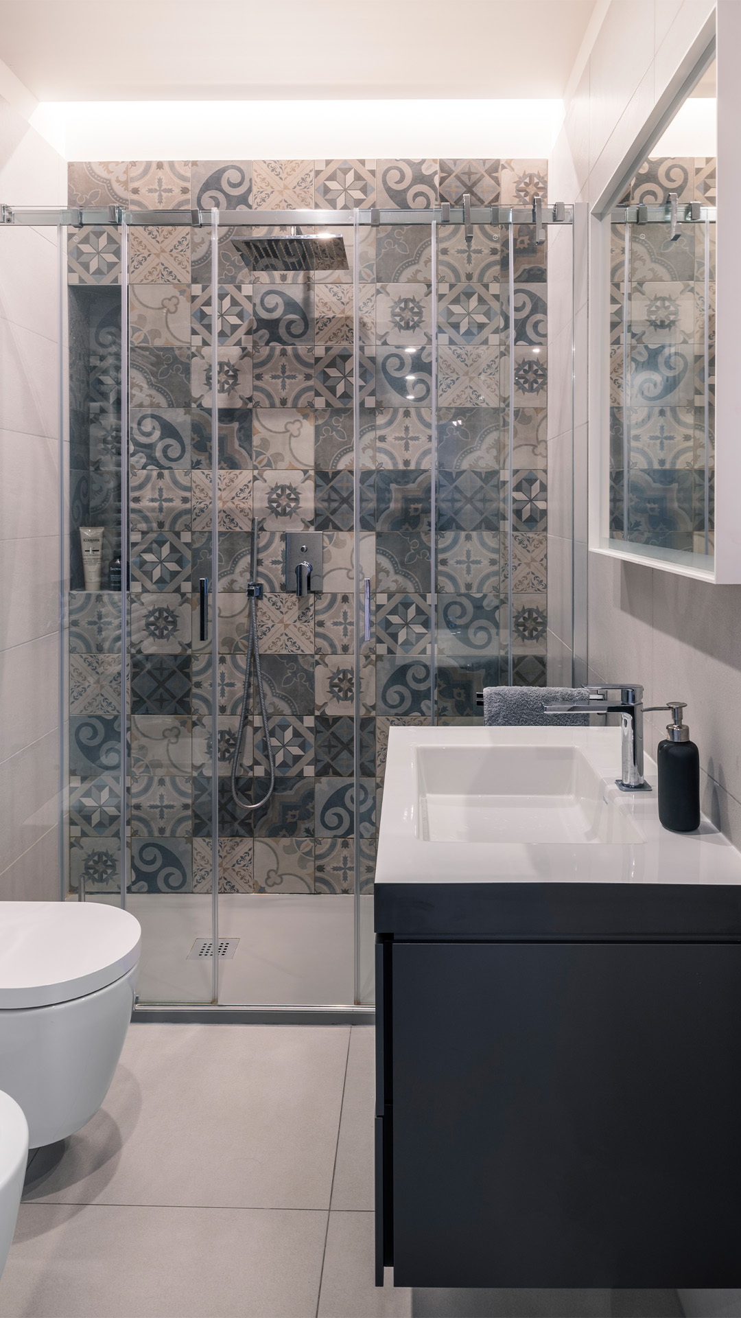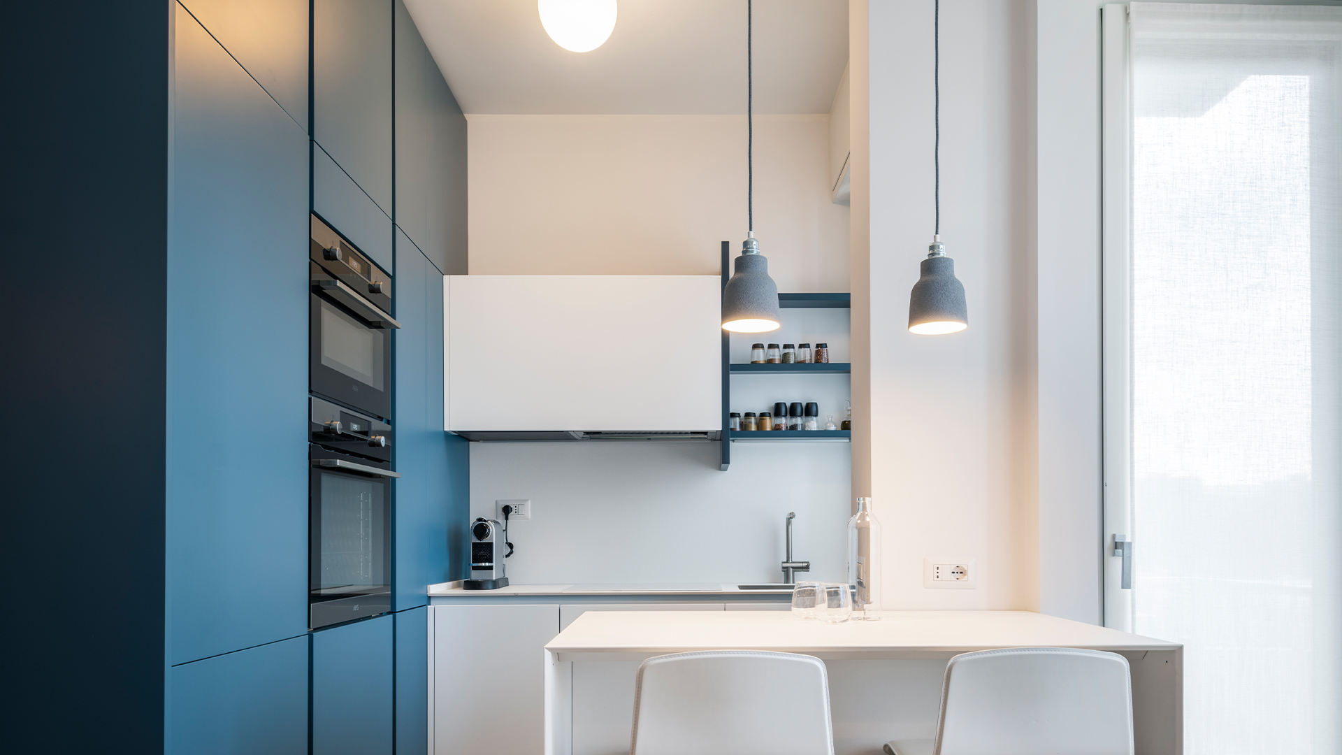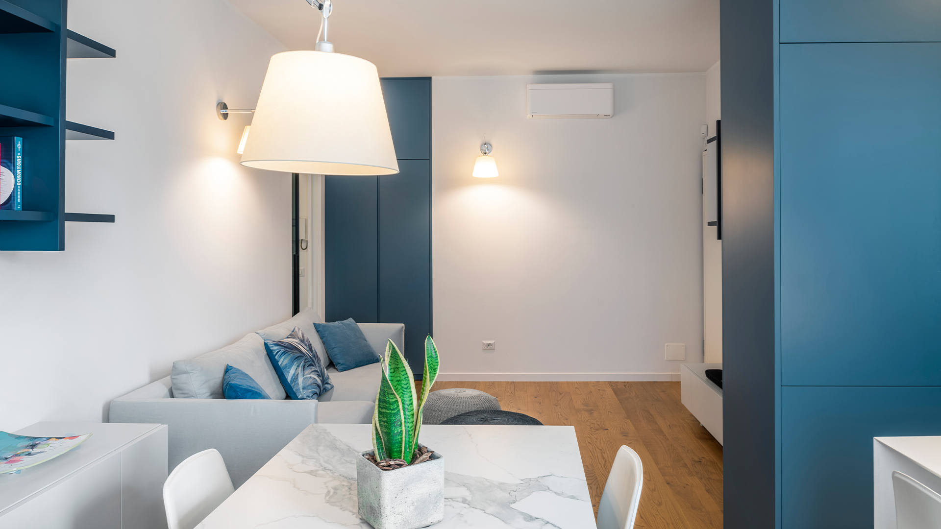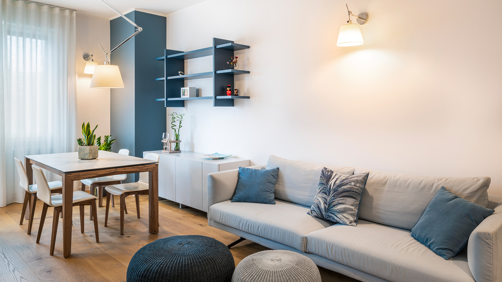 La palette materica studiata prevede materiali caldi e accoglienti come il legno color miele dei pavimenti e gli azzurri per le pareti, fino a un blu oltremare per gli arredi fissi. Piastrelle con fantasie geometriche arricchiscono i bagni.