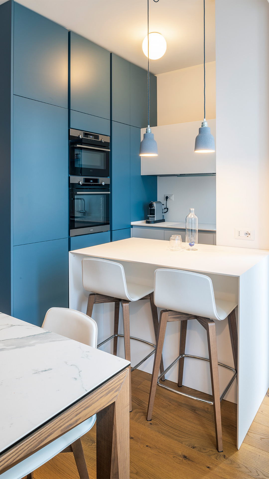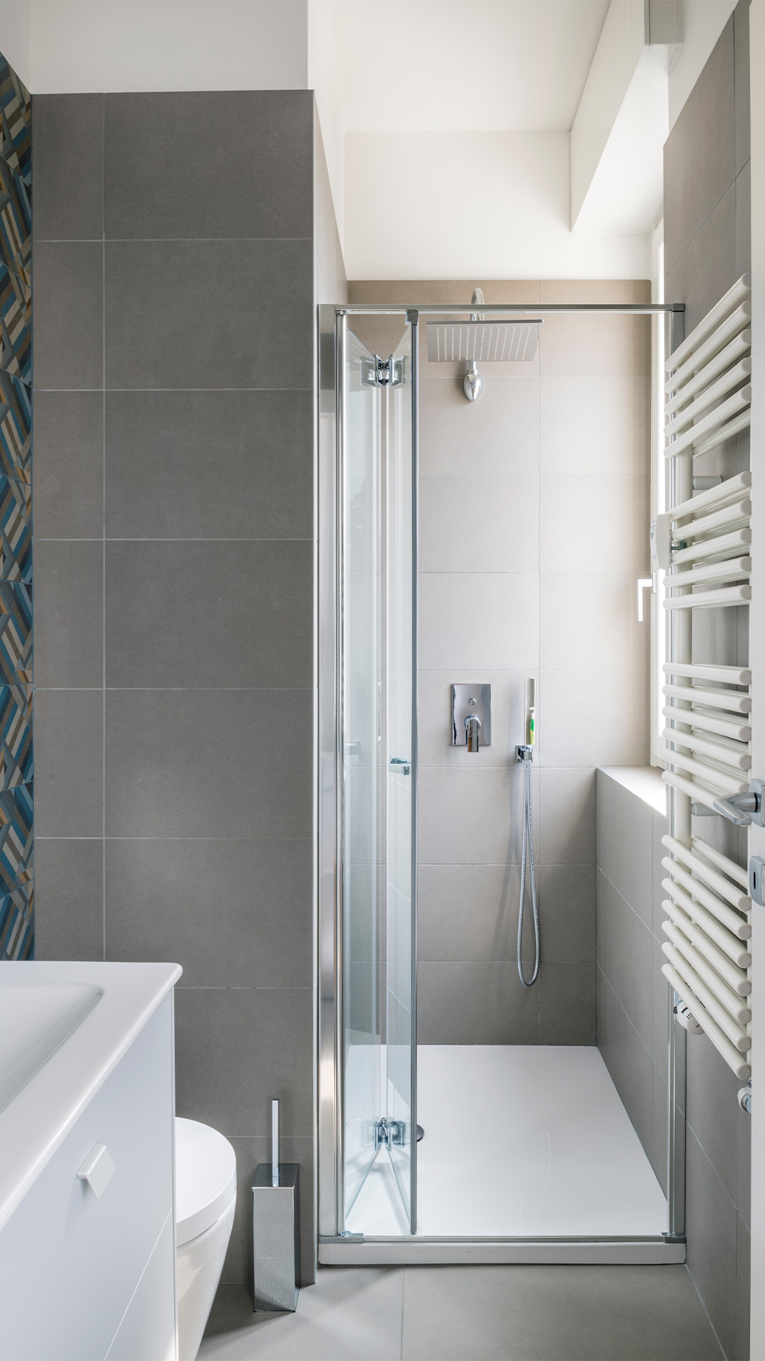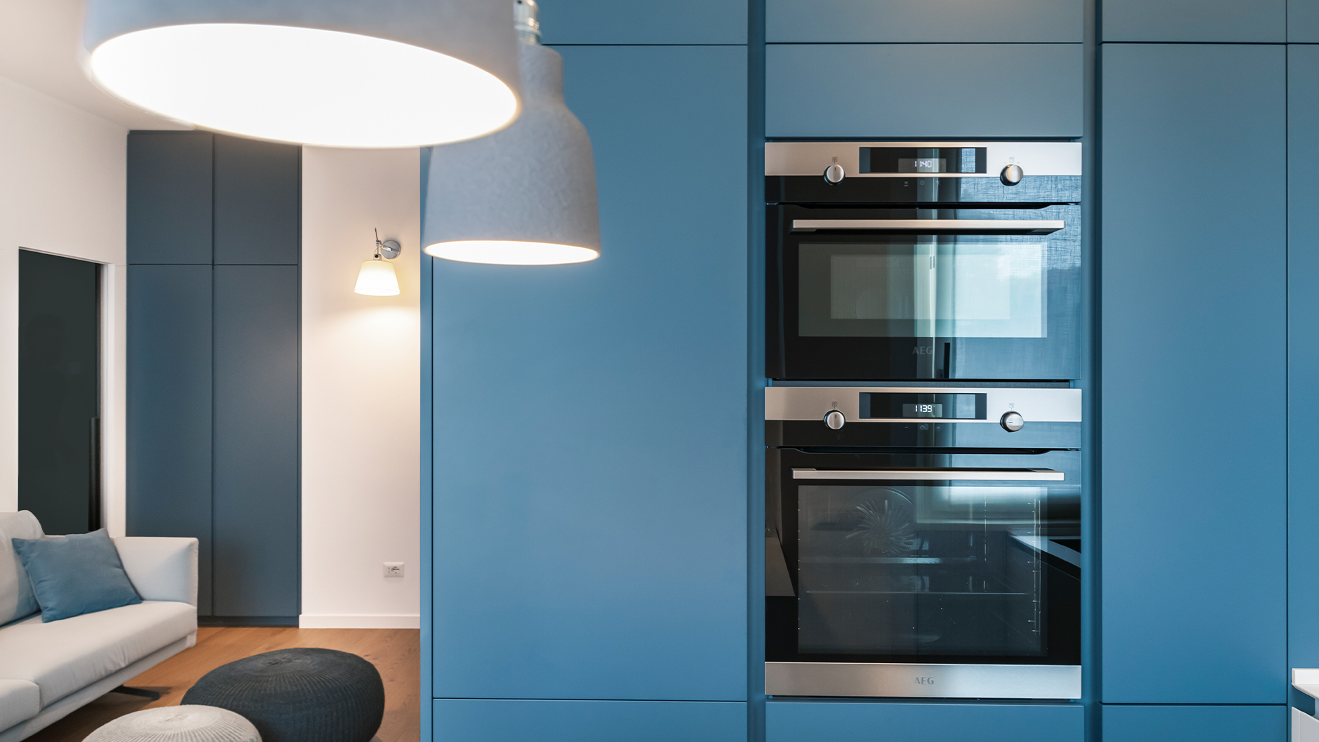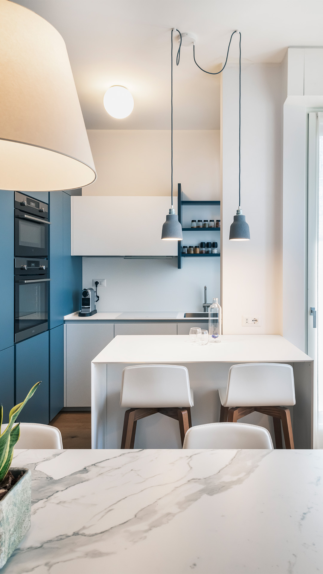 La palette materica studiata prevede materiali caldi e accoglienti come il legno color miele dei pavimenti e gli azzurri per le pareti, fino a un blu oltremare per gli arredi fissi. Piastrelle con fantasie geometriche arricchiscono i bagni.