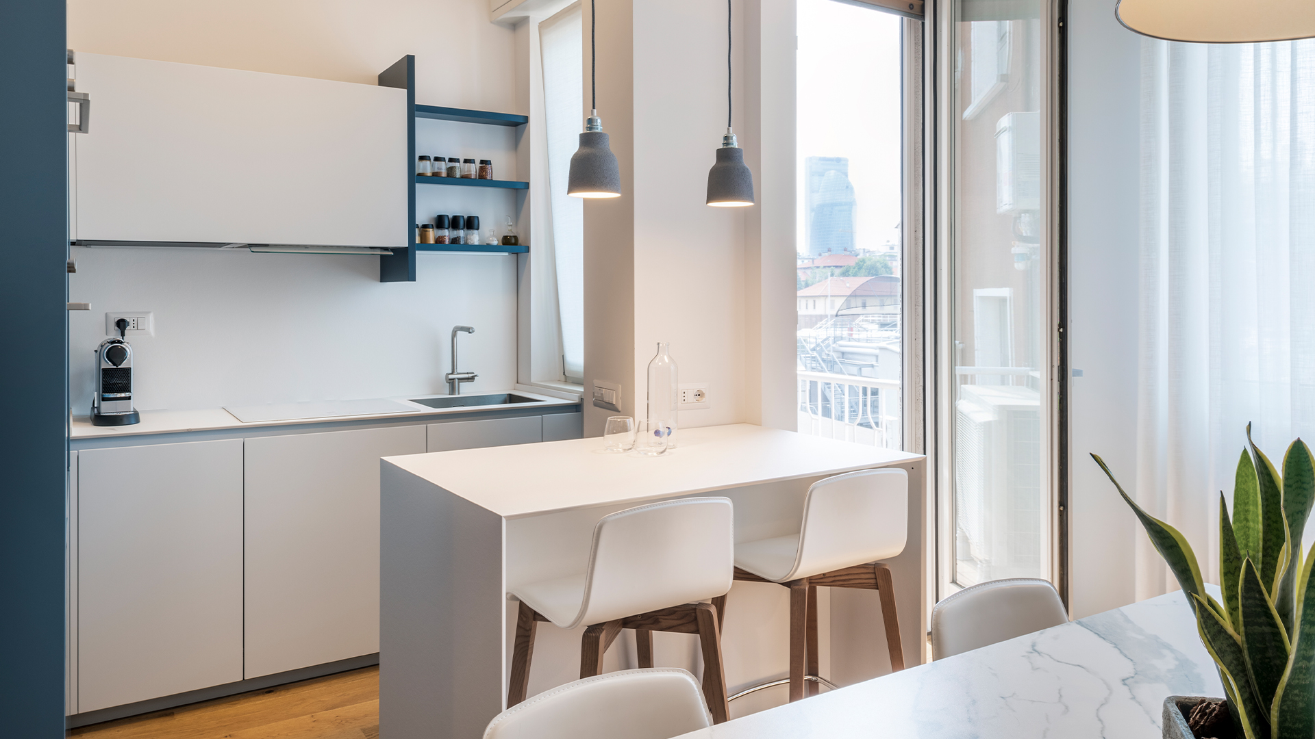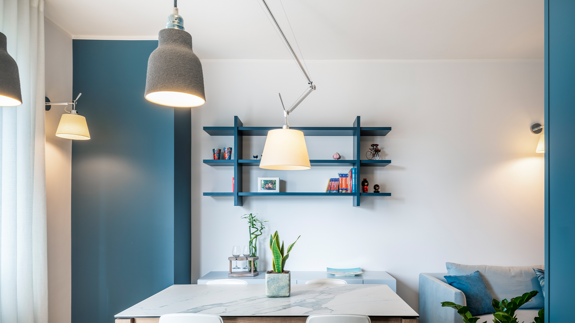 Un volume pieno ospita lo spazio dispensa e gli elettrodomestici della cucina, separando la zona giorno dall’angolo cottura e pranzo. I mobili, disegnati su misura, si rimandano l’un l’altro in un gioco di colori e bicromie, diventando ora libreria, ora credenza.
