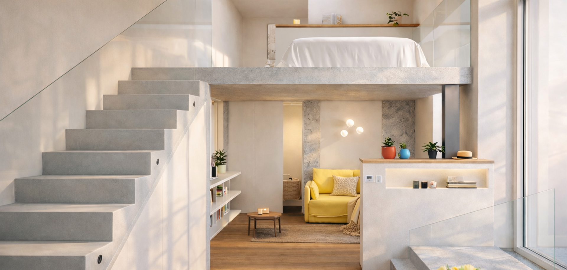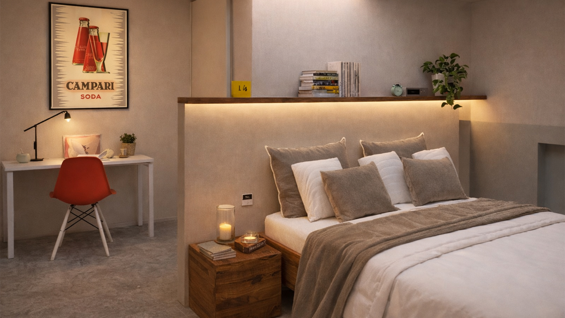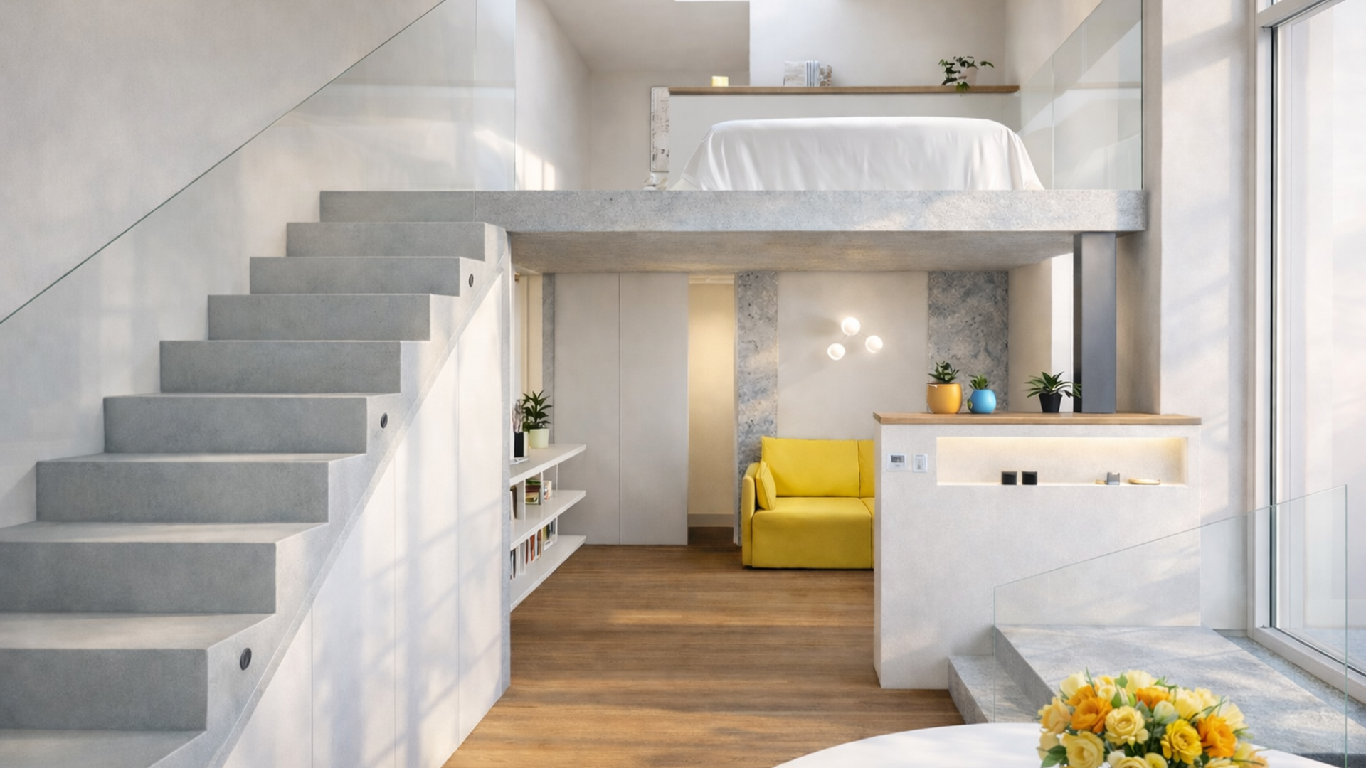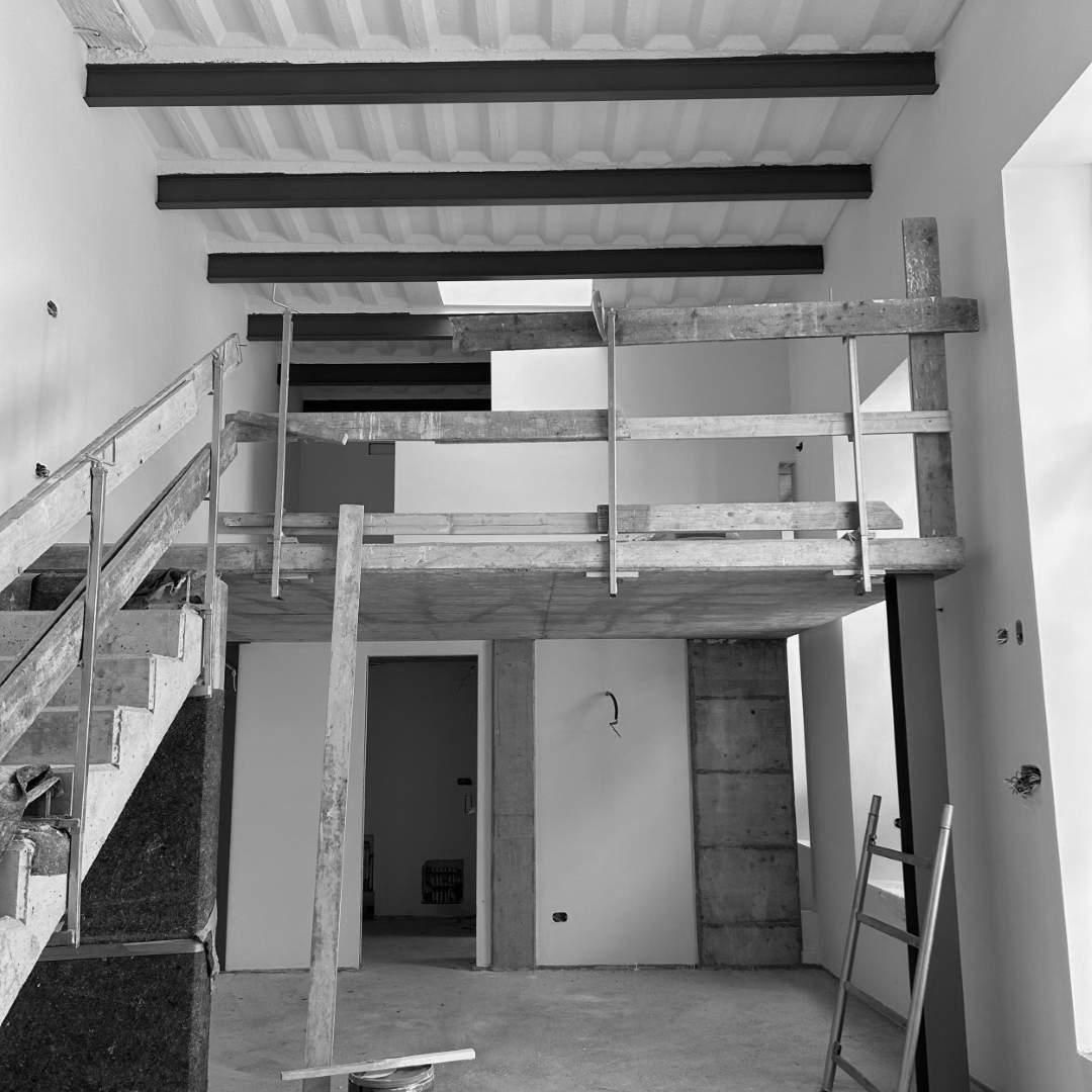 L’intervento parte da un risanamento profondo dell’immobile, ponendo le basi per un ambiente sano e confortevole. Al piano terra prende forma una zona giorno luminosa con soggiorno e angolo cottura, affiancata da un bagno organizzato in modo funzionale. Sopra, un soppalco raggiungibile tramite scala interna accoglie la zona notte, sfruttando l’altezza esistente per creare un dialogo verticale tra gli spazi e amplificare la percezione del volume.